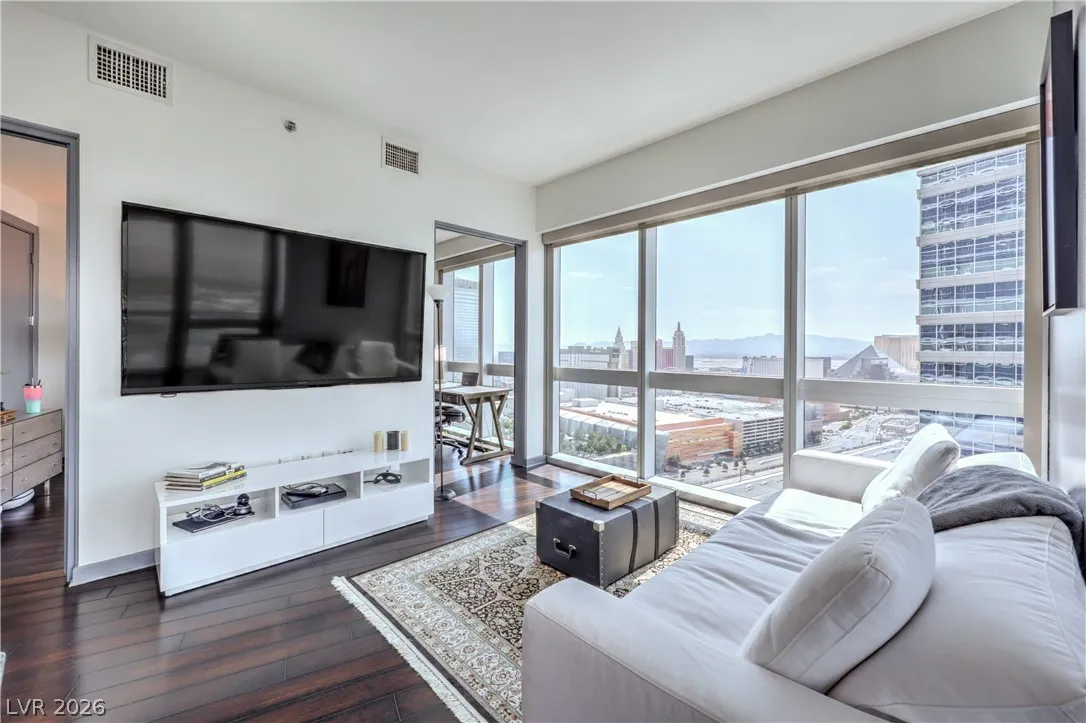 Experience elevated high-rise living at Residence 3201 in The Martin. This stunning 2-bedroom, 2-bath residence is offered as a turn-key furnished rental, thoughtfully designed for both comfort and style. Floor-to-ceiling windows frame breathtaking panoramic views of the Las Vegas Strip, filling the open-concept living space with natural light and showcasing the vibrant skyline day and night.