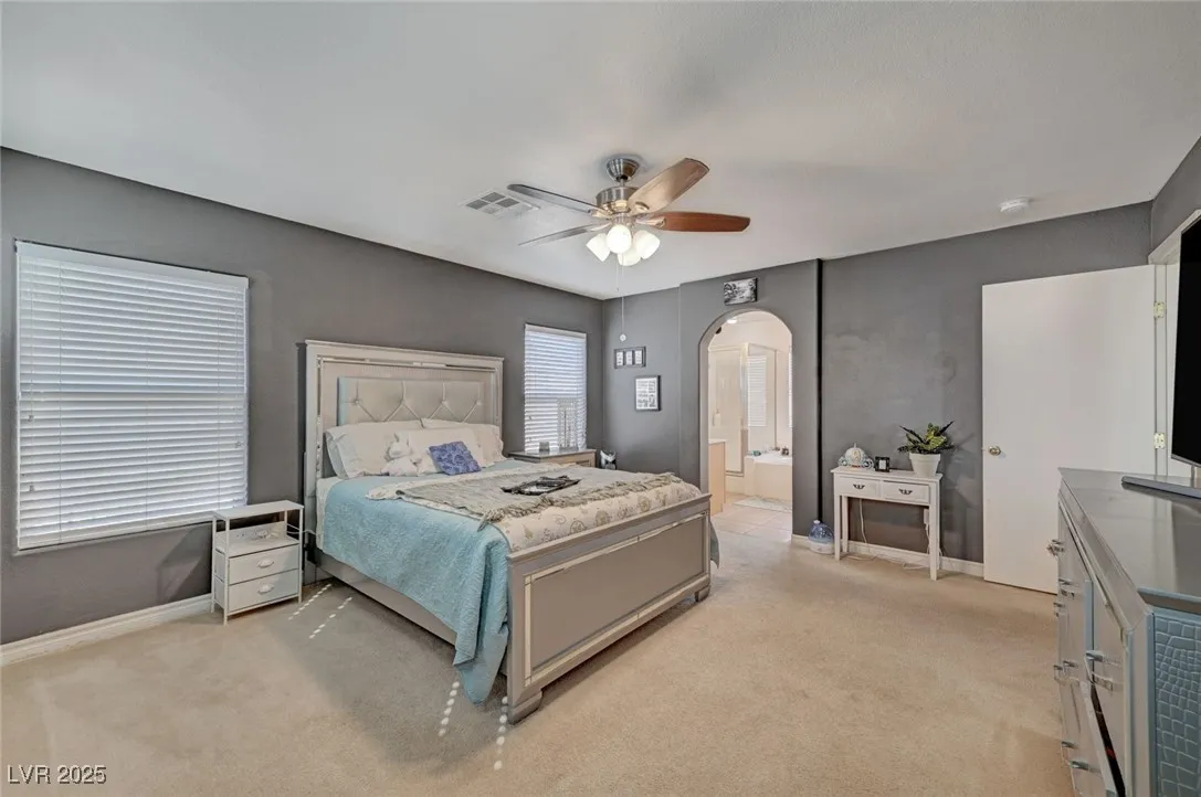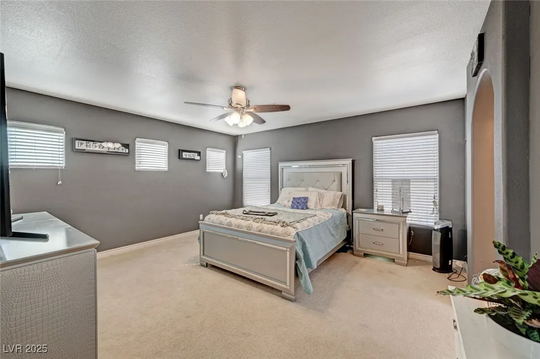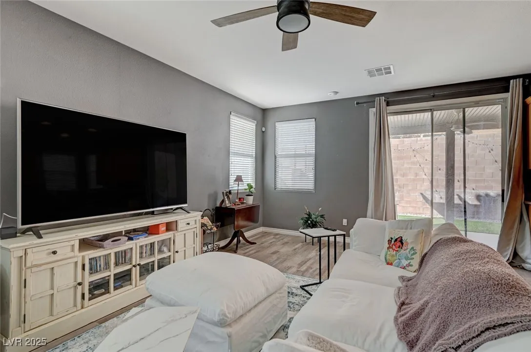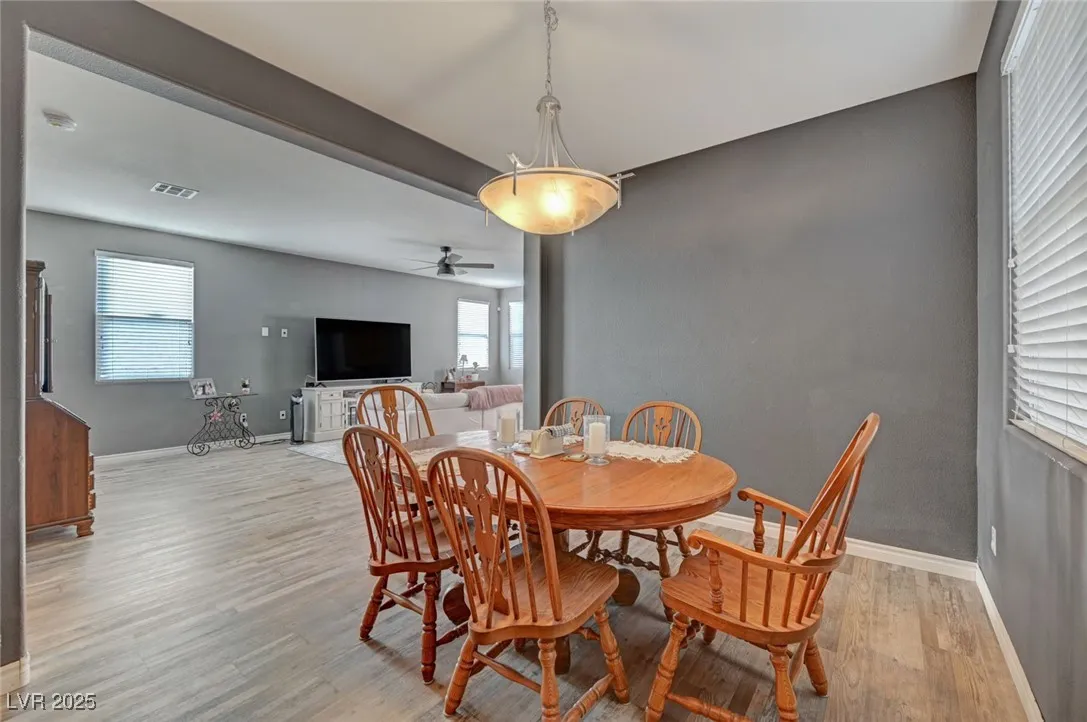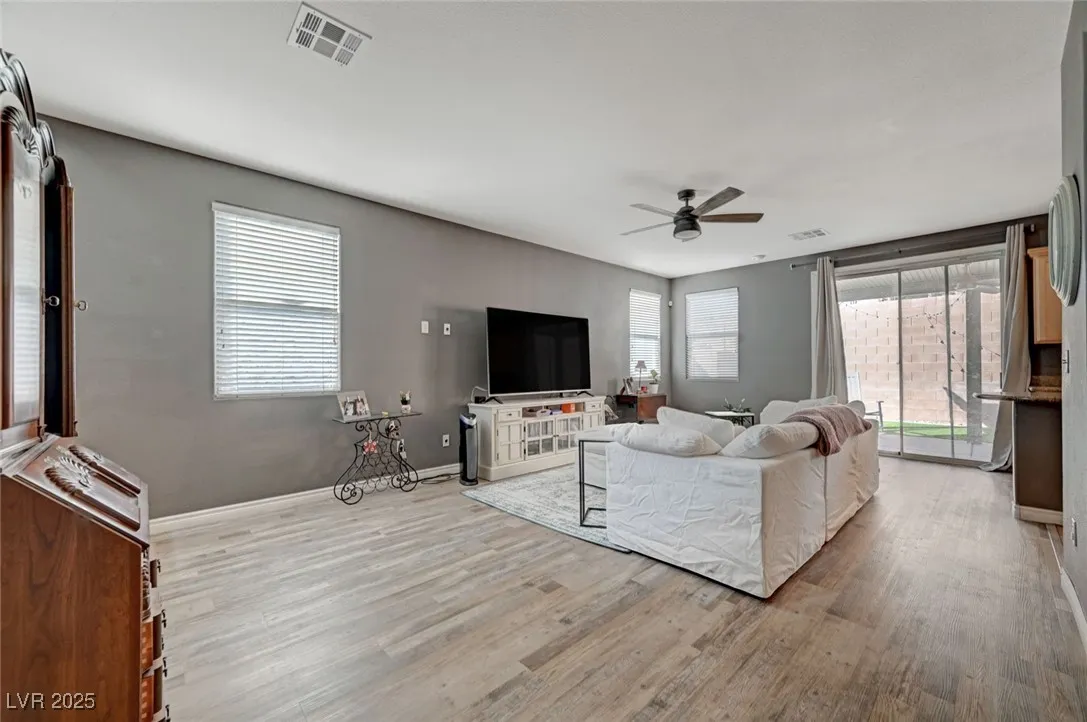Open Spacious Floor Plan and Move-In Ready! Large Great Room, Dining Room, Kitchen Configuration Allows for Lots of Entertaining; Ceiling Fans with Lights Throughout; Hard Surface Flooring in All High Traffic Areas with Carpet in Bedrooms; Kitchen Offers Custom Cabinets, Granite Counters, Center Island and Pantry; Double Lofts Upstairs; Primary Bedroom Separate from Secondary Bedrooms; Separate Shower and Tub in Primary Bath; Laundry Room Upstairs; Covered Patio; Easy Care Landscaping with Turf in Back Yard. Easy Access to Sports, Entertainment, Dining, Shopping and Schools.