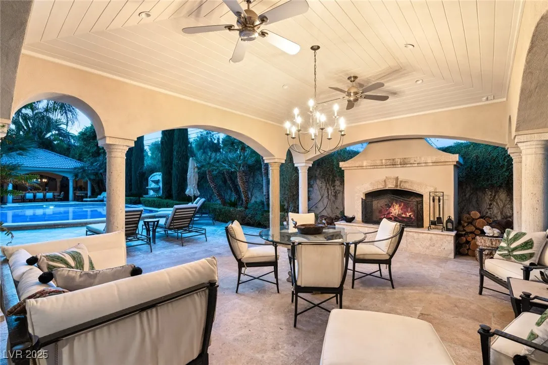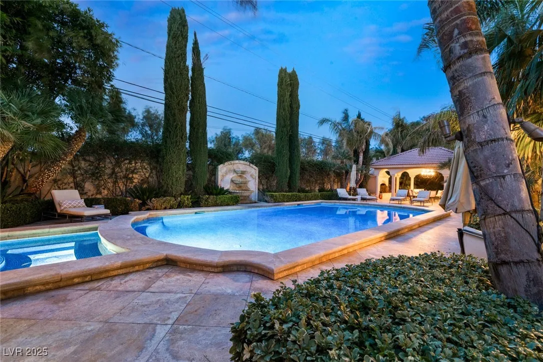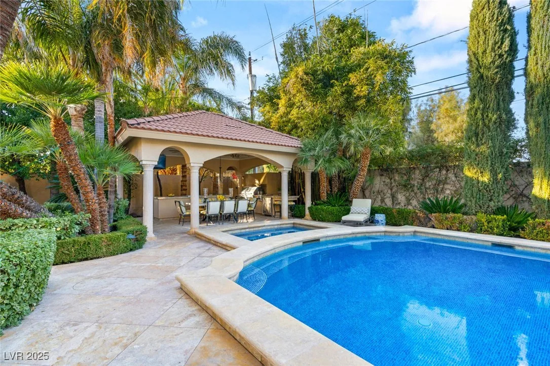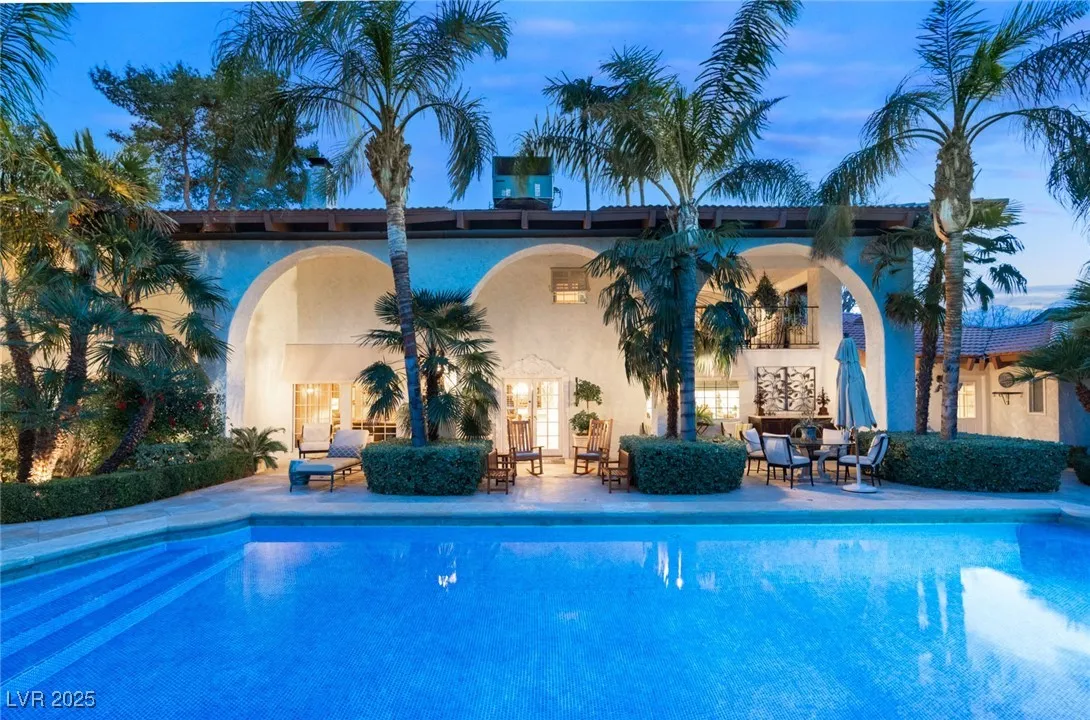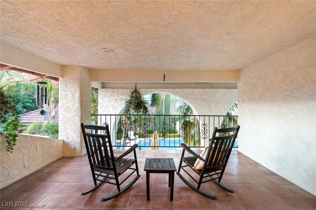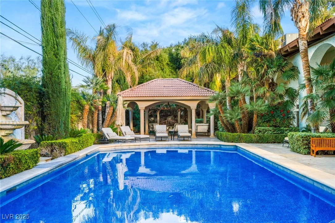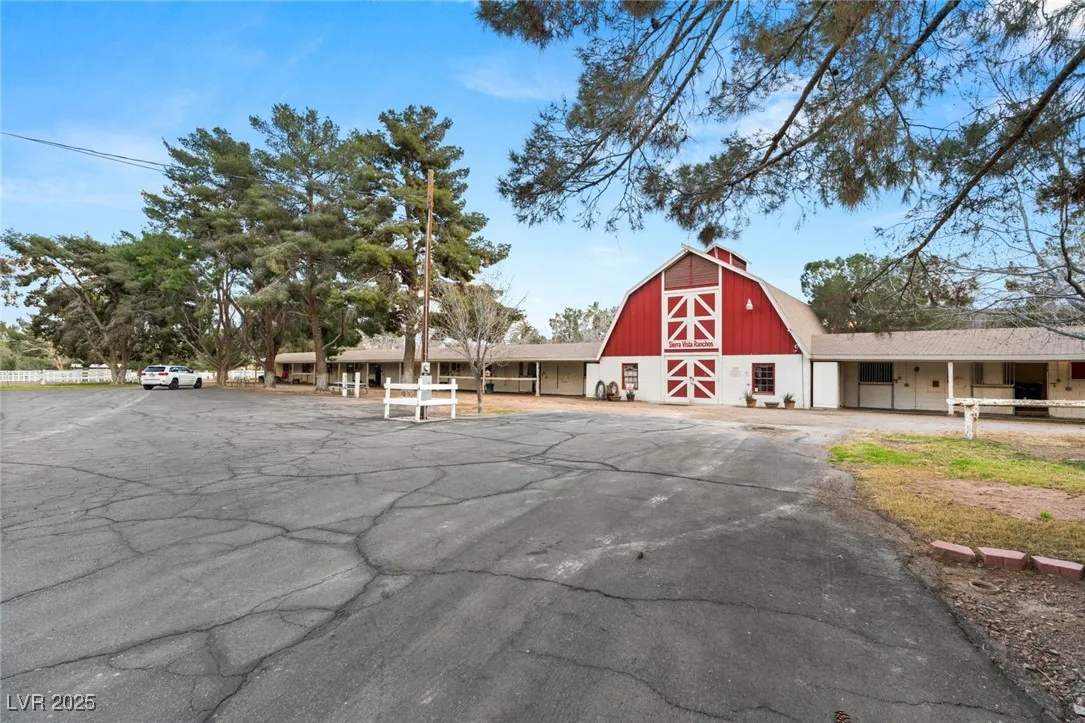 This timeless and classic Estate has quality details and finishes. 24 hr. guard gated Equestrian community. Wood flooring, Baccarat chandeliers, family room with bar, 2 downstairs bedrooms, one currently as office. Balconies with views, refreshed kitchen, grand foyer with sweeping staircase. Stunning backyard with 1 million dollars spent on remodel. All tiled pool and Spa, outdoor kitchen with two dining areas. Private retreat in backyard, fountain, mature landscape. Mother-in-law suite downstairs is wheelchair accessible with its own entrance. Plenty of space for additional garages to be built. Pristine! – **Sierra Vista Ranchos in Las Vegas has a 20-stall barn. While there are 20 stalls, 16+ are typically used for horses, with the other two reserved for hay storage. The stables are self-care, meaning horse owners are responsible**All drapes do not convey**