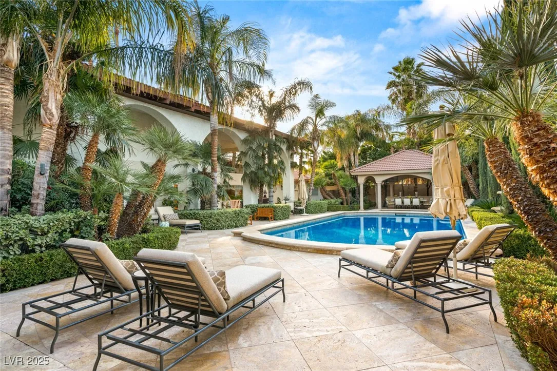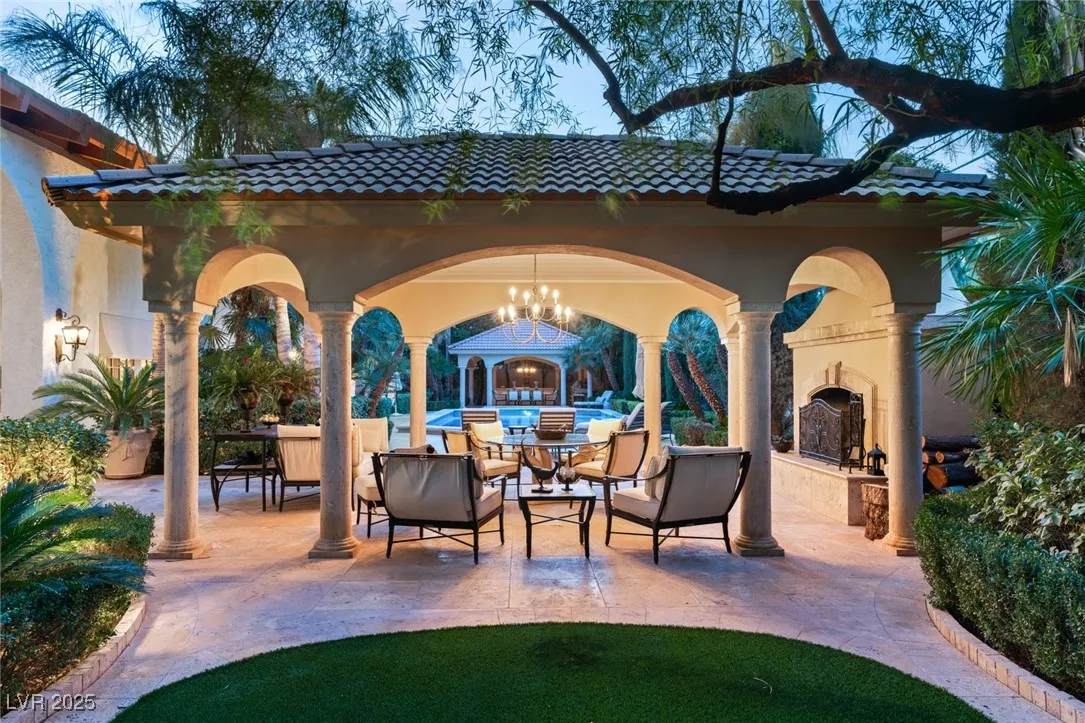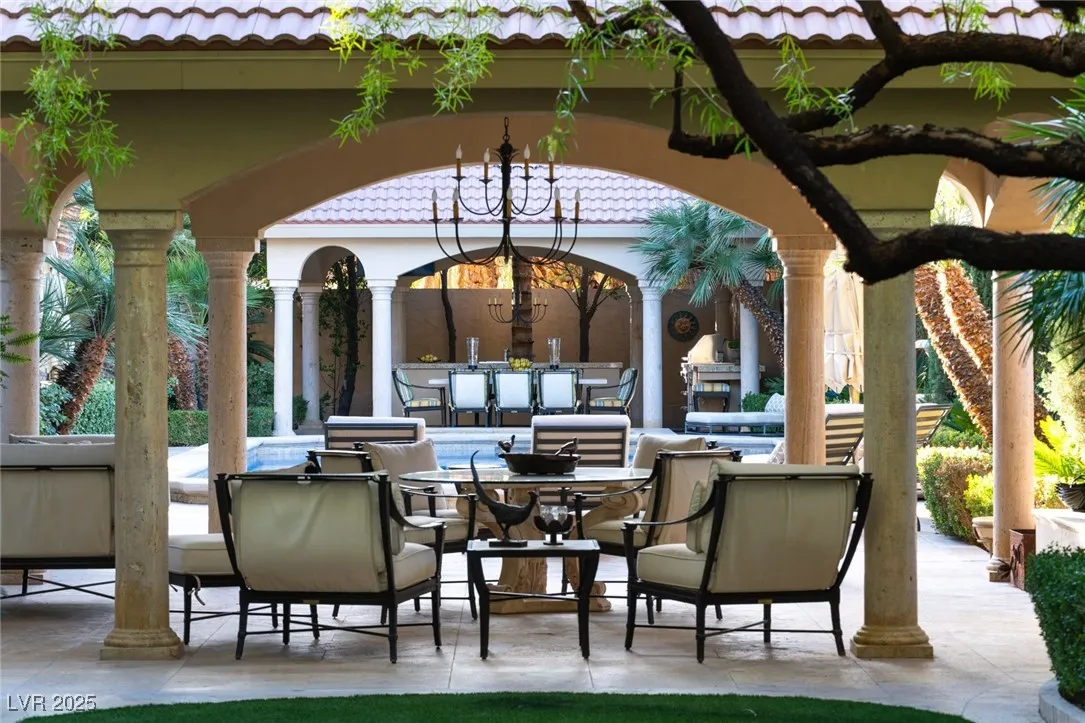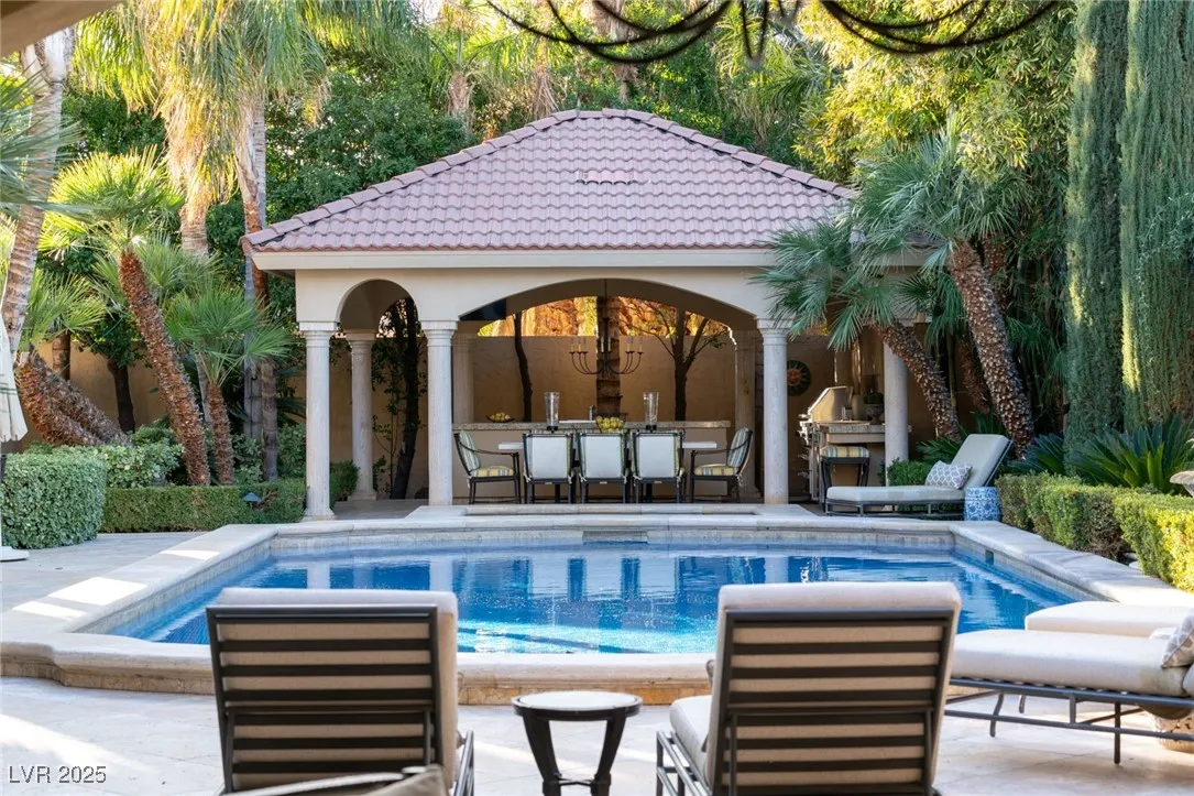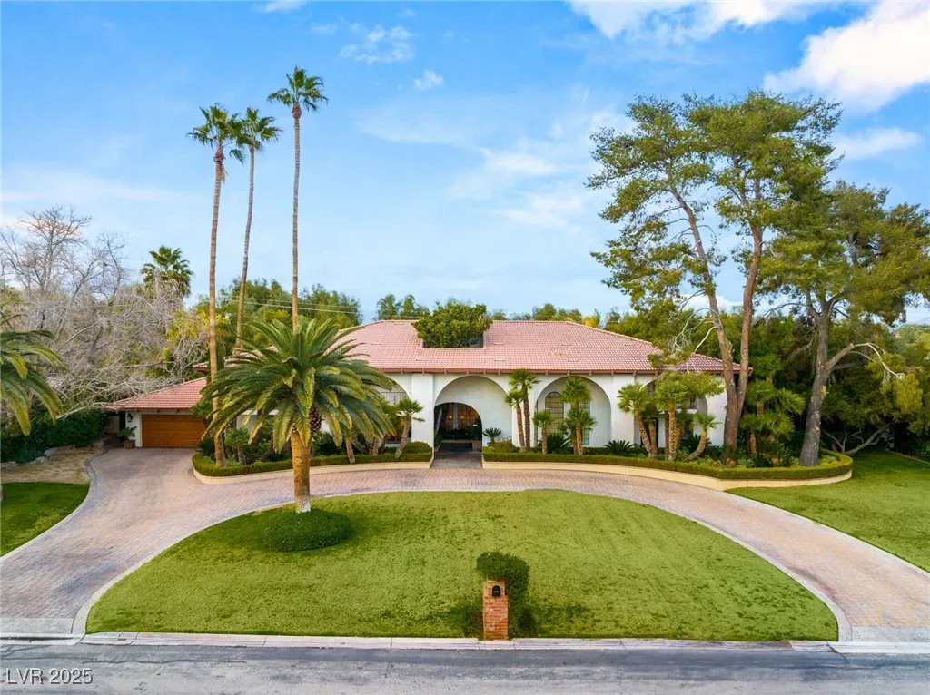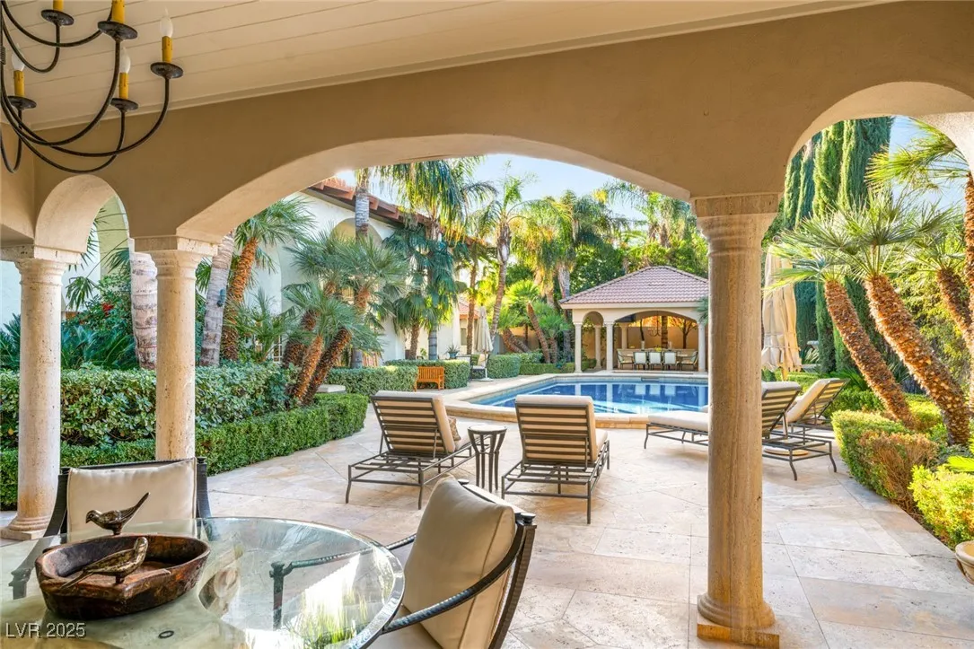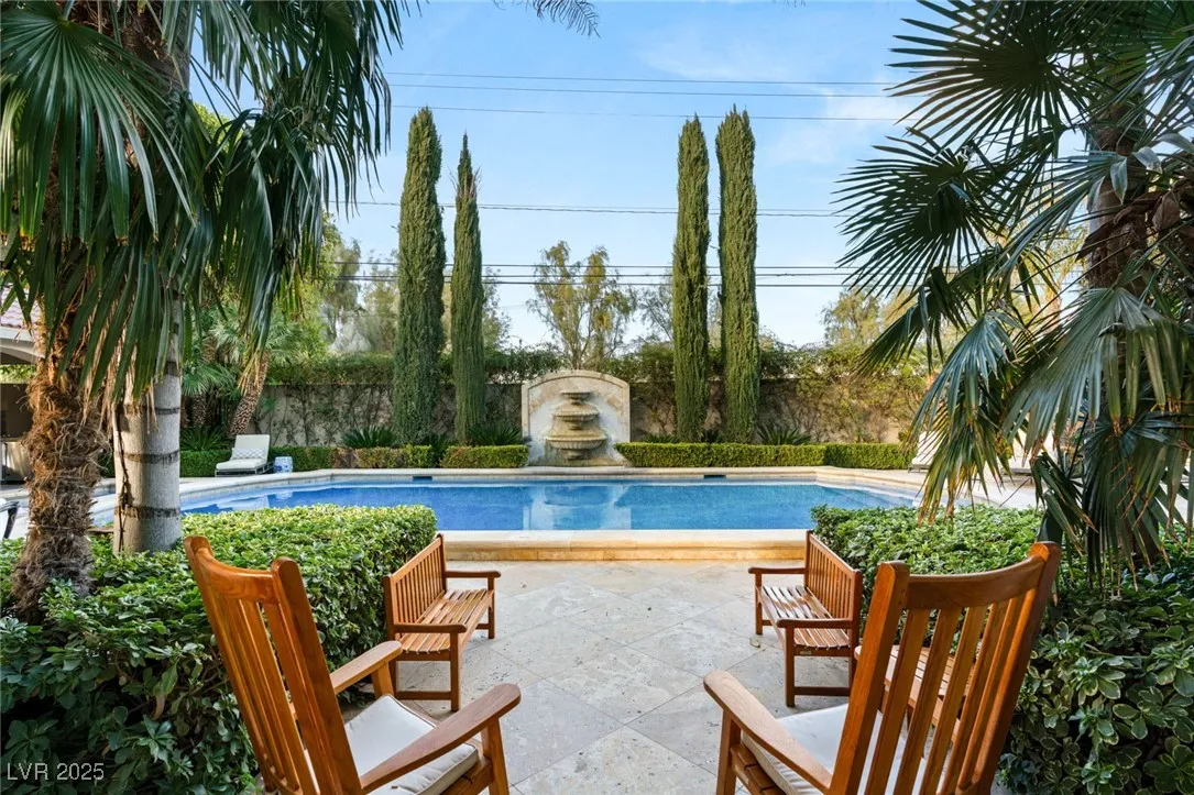 This timeless and classic Estate has quality details and finishes. 24 hr. guard gated Equestrian community. Wood flooring, Baccarat chandeliers, family room with bar, 2 downstairs bedrooms, one currently as office. Balconies with views, refreshed kitchen, grand foyer with sweeping staircase. Stunning backyard with 1 million dollars spent on remodel. All tiled pool and Spa, outdoor kitchen with two dining areas. Private retreat in backyard, fountain, mature landscape. Mother-in-law suite downstairs is wheelchair accessible with its own entrance. Plenty of space for additional garages to be built. Pristine! – **Sierra Vista Ranchos in Las Vegas has a 20-stall barn. While there are 20 stalls, 16+ are typically used for horses, with the other two reserved for hay storage. The stables are self-care, meaning horse owners are responsible**All drapes do not convey**