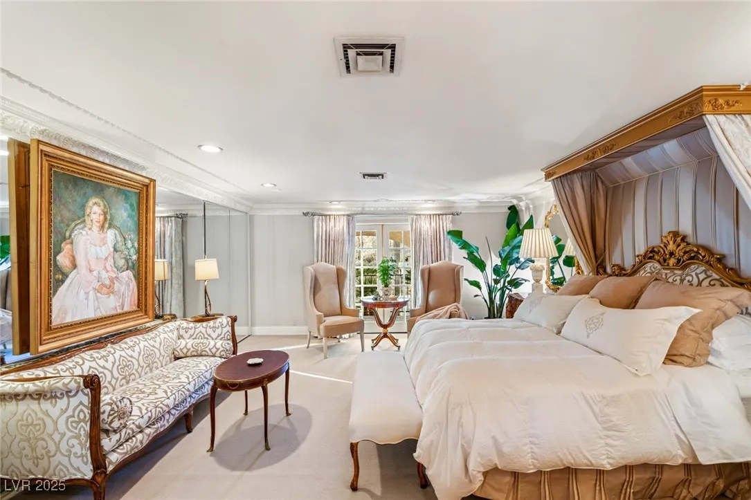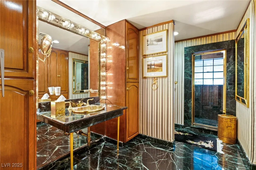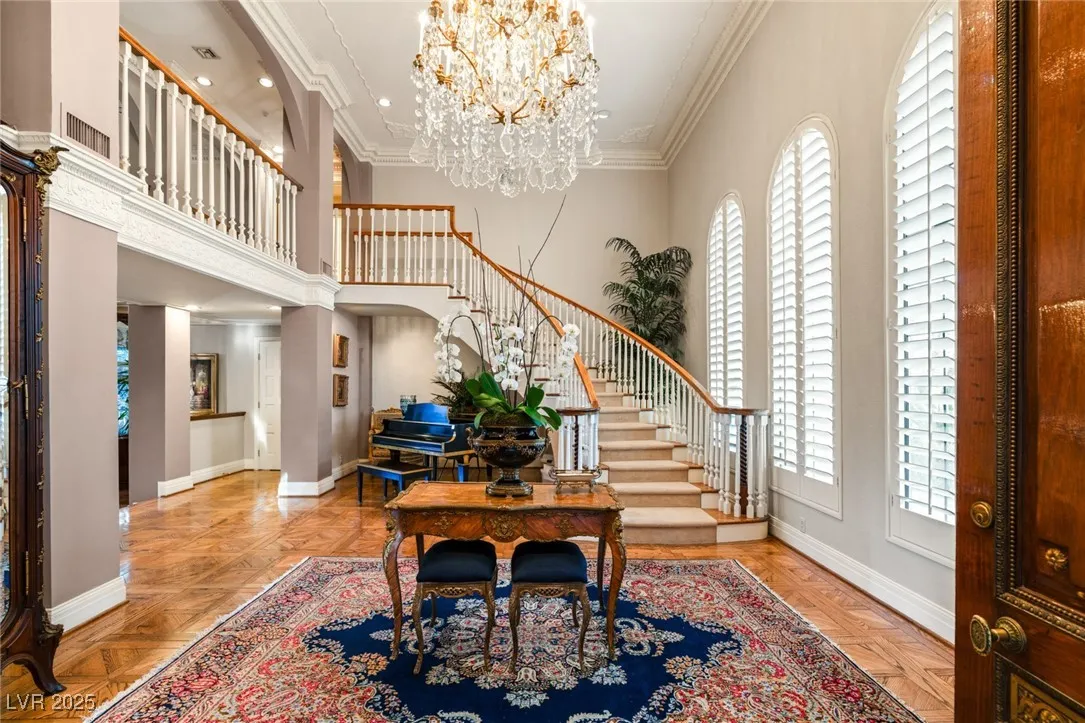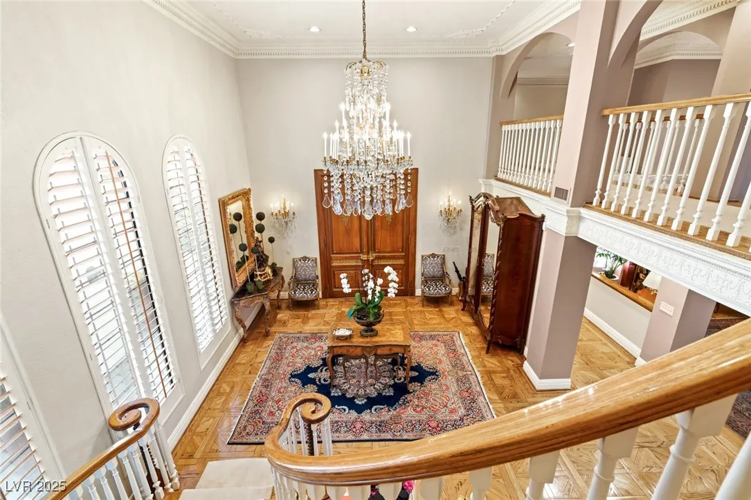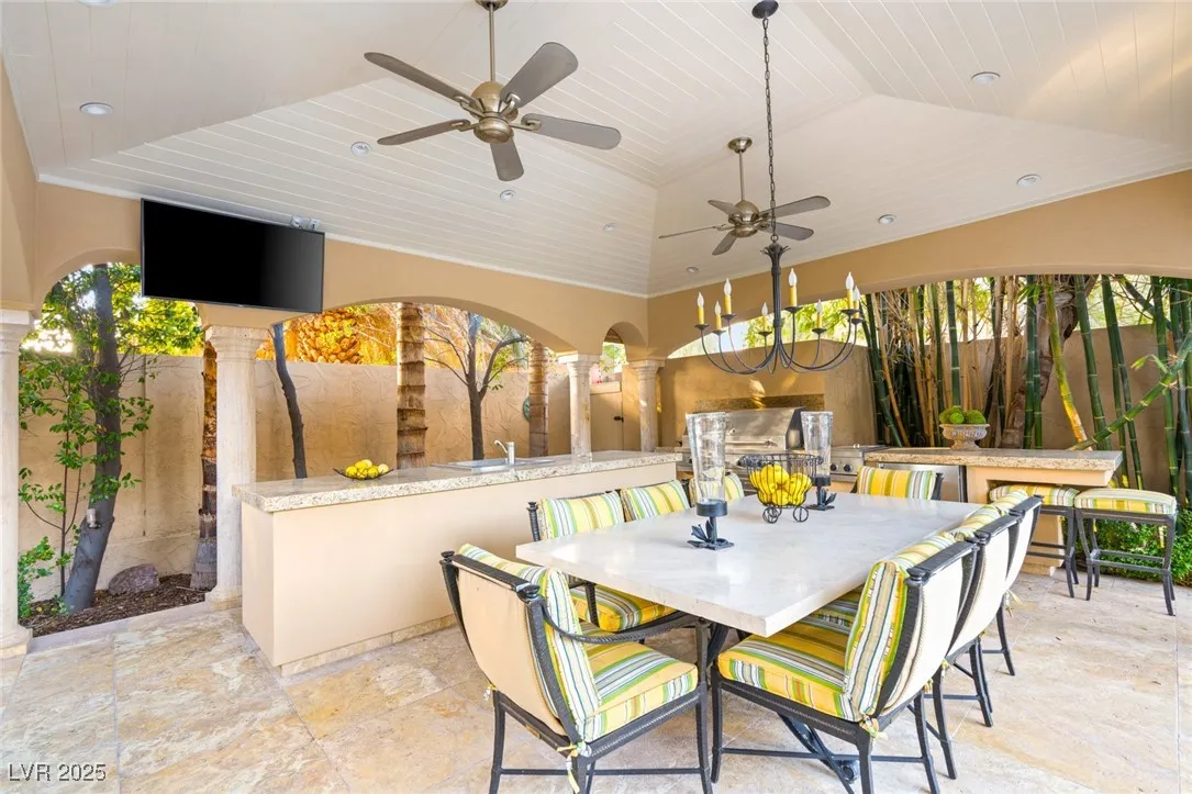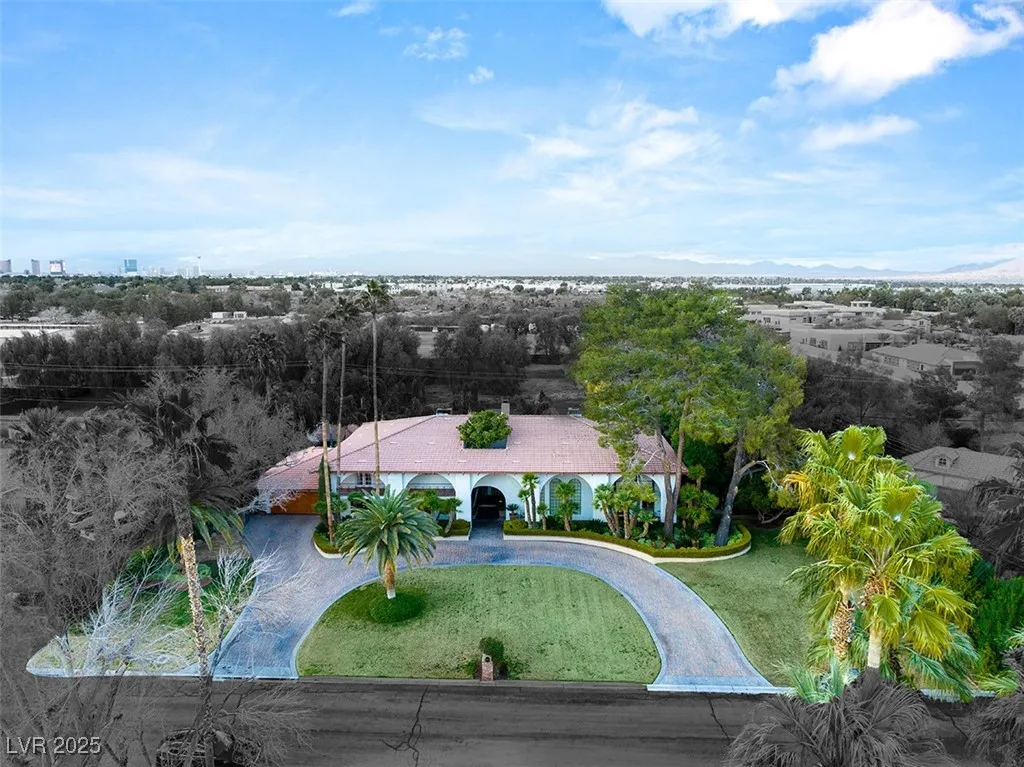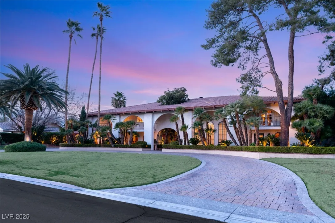 This timeless and classic Estate has quality details and finishes. 24 hr. guard gated Equestrian community. Wood flooring, Baccarat chandeliers, family room with bar, 2 downstairs bedrooms, one currently as office. Balconies with views, refreshed kitchen, grand foyer with sweeping staircase. Stunning backyard with 1 million dollars spent on remodel. All tiled pool and Spa, outdoor kitchen with two dining areas. Private retreat in backyard, fountain, mature landscape. Mother-in-law suite downstairs is wheelchair accessible with its own entrance. Plenty of space for additional garages to be built. Pristine! – **Sierra Vista Ranchos in Las Vegas has a 20-stall barn. While there are 20 stalls, 16+ are typically used for horses, with the other two reserved for hay storage. The stables are self-care, meaning horse owners are responsible**All drapes do not convey**