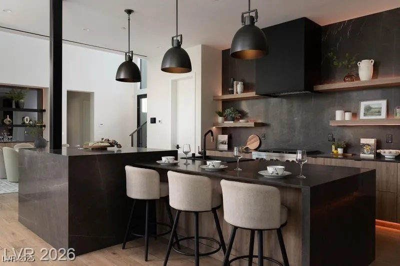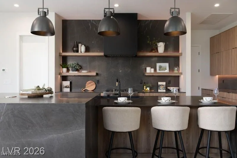 Located within the brand-new gated subdivision of The Estates at Lone Mountain, this half-acre home comes fully turnkey. In this exclusive nine-lot community, The Spire plan offers a thoughtfully designed two-story layout with 4 bedrooms, 4.5 baths, an upstairs game room, and an attached RV garage. The home’s modern exterior showcases metal-clad and natural stone accents, while the interior embraces a refined industrial design that balances warmth with a touch of edge. Matte black and wood cabinetry, natural stone cladding, and warm wood floors are complemented by metal elements throughout the home.