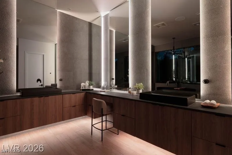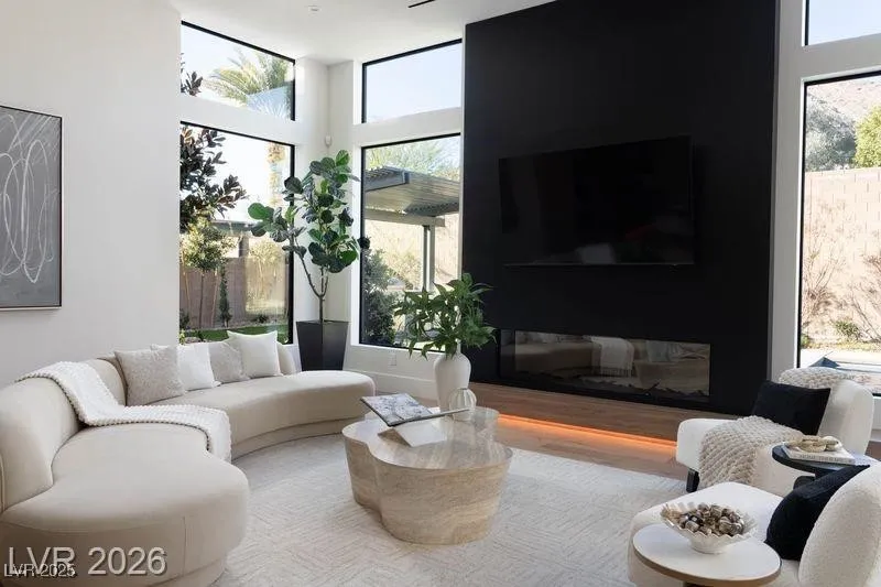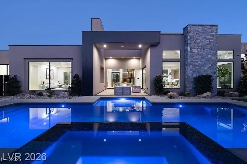Floor-to-ceiling windows fill the space with natural light and frame stunning views of Lone Mountain. This home features a heated pool and spa, a fully landscaped lot, a private entry courtyard, an outdoor shower, minimal HOA restrictions, Control4 smart home technology, and an integrated sound and security system—offering a seamless blend of sophistication and comfort