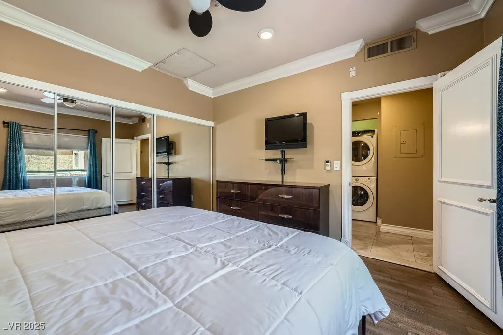 JUST REDUCED!!! TOP FLOOR, FULLY FURNISHED CONDO at The Meridian. Experience resort-style living in the heart of Las Vegas at The Meridian. This stunning nearly 700 sq. ft. condo is the perfect blend of comfort, style & convenience—ideal as a full-time residence, vacation getaway, or investment property. Step inside to find a beautifully appointed interior with stainless steel appliances, in-unit washer and dryer, dual pane windows & slider, ceiling fans,kitchenware, linens, and easy access to the AC compressor. Enjoy your morning coffee or unwind in the evening while taking in lush views—including a view of the iconic Sphere. The Meridian list of amenities including: Resort-style pools & cabanas, Relaxing spa, fully equipped fitness center, Racquetball & tennis courts, BBQ areas and beautifully landscaped grounds and Assigned indoor parking. Just moments away from world-class dining, entertainment, and nightlife—only 1.5 blocks from the Las Vegas Strip!