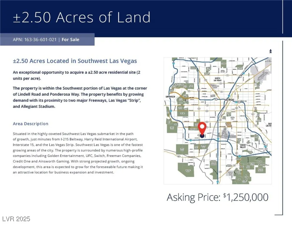 An exceptional opportunity to acquire a ±2.50 acre residential site (2 units per acre). The property is within the Southwest portion of Las Vegas at the corner of Lindell Road and Ponderosa Way. The property benefits by growing demand with its proximity to two major Freeways, Las Vegas “Strip”, and Allegiant Stadium. Situated in the highly coveted Southwest Las Vegas submarket in the path