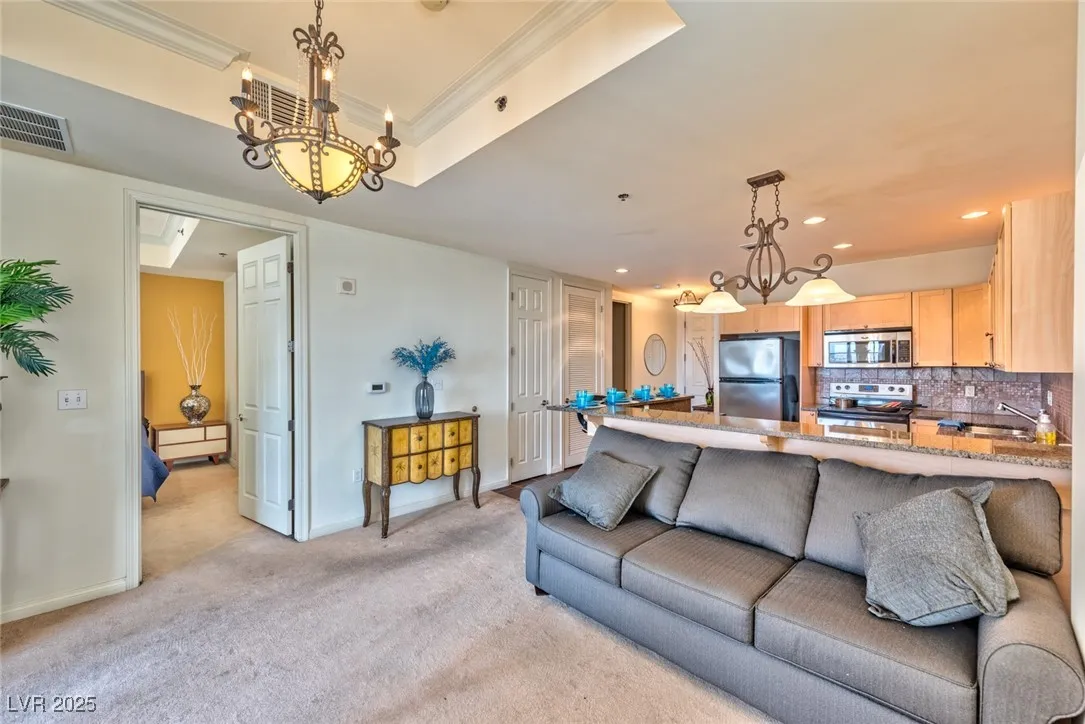 Experience resort-style living in this stunning partially furnished condo, located in a highly desirable guard-gated community in Las Vegas. Perfectly situated near top-rated K–12 schools, shopping, dining, and popular attractions, this home offers the ideal blend of comfort and convenience. The open-concept layout features a modern kitchen with stainless steel appliances, granite countertops, recessed lighting, ample cabinetry, and stylish tile flooring that flows into a bright and inviting living area. Step outside to your private balcony and enjoy peaceful views of the community. The spacious primary suite includes a large walk-in closet and en-suite bath with dual sinks, generous counter space, and a walk-in shower. Enjoy access to luxurious community amenities including a clubhouse, sparkling pool and spa, firepit lounge, and a fully equipped fitness center. Don’t miss this incredible opportunity—schedule your private showing today before it’s gone!