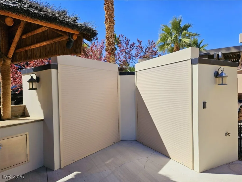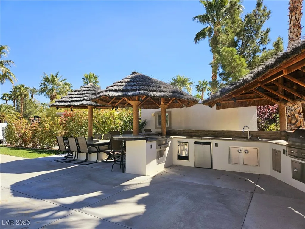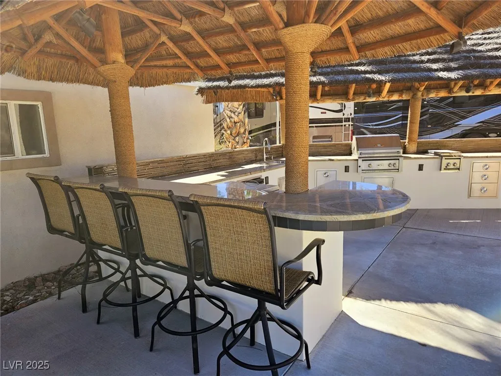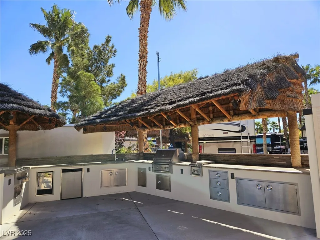 Located within the Class A Las Vegas Motorcoach Resort, this site is ready to move in and enjoy! Amazing fully built site with multiple palapas including a large rectangle palapa with a full outdoor kitchen with granite counters, bar area, dining area, and two roll up door storage areas with a washer and dryer.
