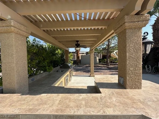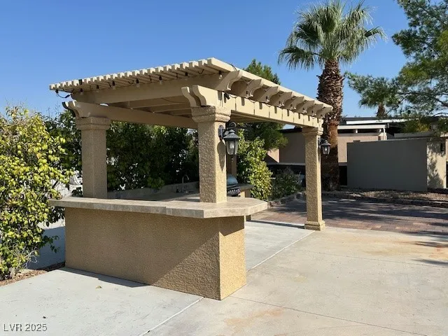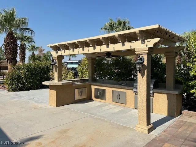 Located in the Guard Gated Las Vegas Motorcoach Resort, this is the lowest priced lot with a hard roof structure! This site includes a beautiful pergola roof cover with bar seating, stainless steel bbq and sink, storage cabinets, and lighting. At the back of the site are decorative pavers and plumbing for future improvements. Golf cart included! Priced to move!