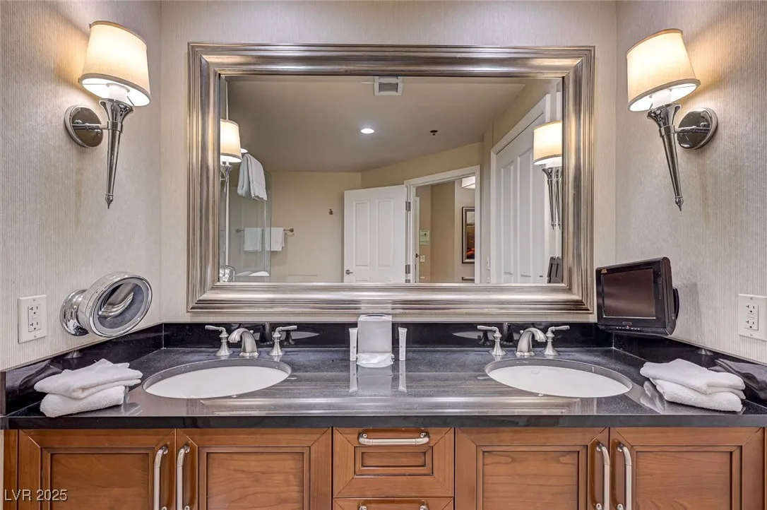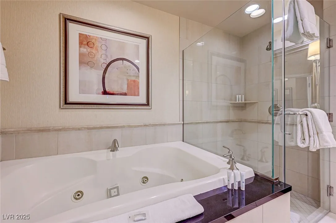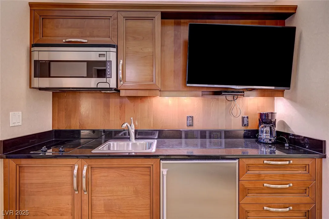 This Penthouse Strip side suite with a balcony showcasing stunning views of the Strip, Formula 1, and Tower 2 pool, the suite provides a captivating backdrop for your stay. Inside, the fully furnished, turnkey suite is designed for comfort and convenience. The kitchenette features high-end stainless steel appliances, including a two-burner stove, microwave, refrigerator, and sink with granite countertops. An media center, a closet with a safe and extra bedding, and a large bathroom with double sinks, a Jacuzzi tub, and walk-in shower enhance the living space. The suite comfortably accommodates four guests with a luxurious king bed and a pullout sleeper couch. Residents have access to MGM Signature’s exclusive offerings. Enjoy three private, heated pools, spas, and cabanas, a lounge with a full bar, gym, valet, concierge, Starbucks, and laundry facilities. Connected to MGM easily access all MGM amentities.