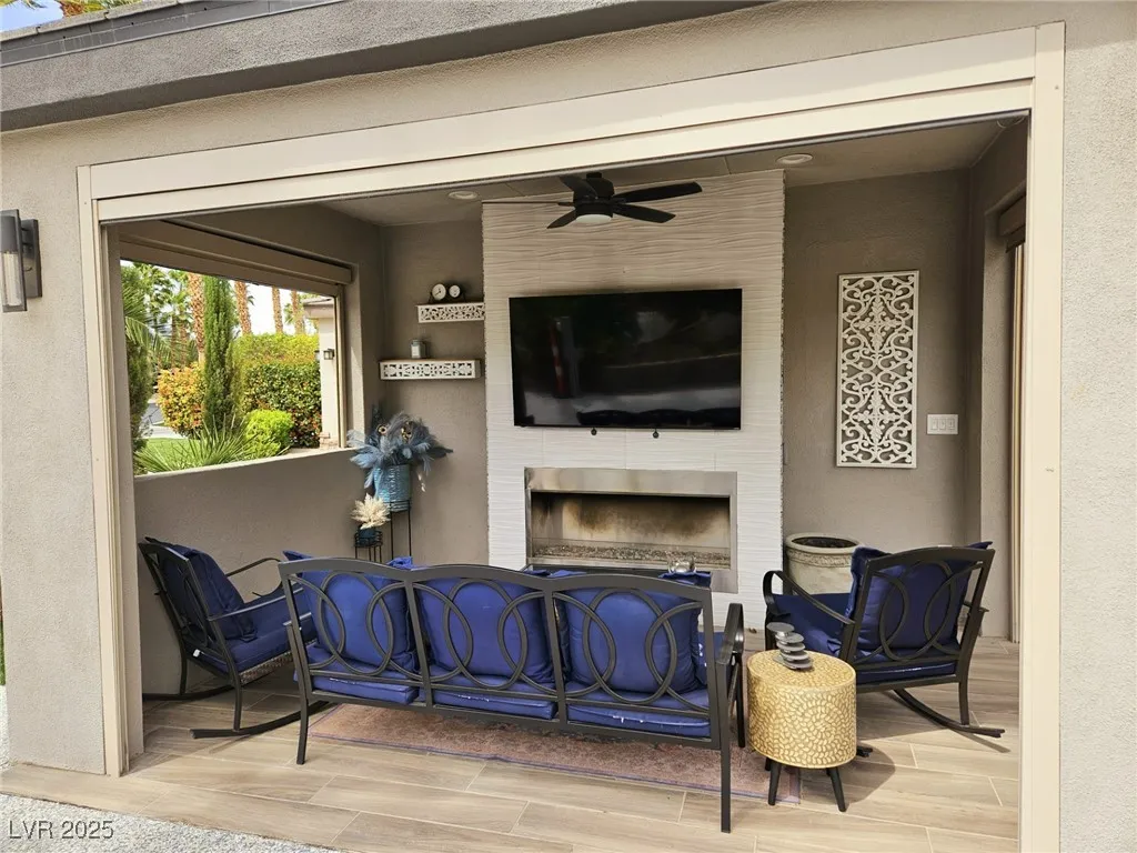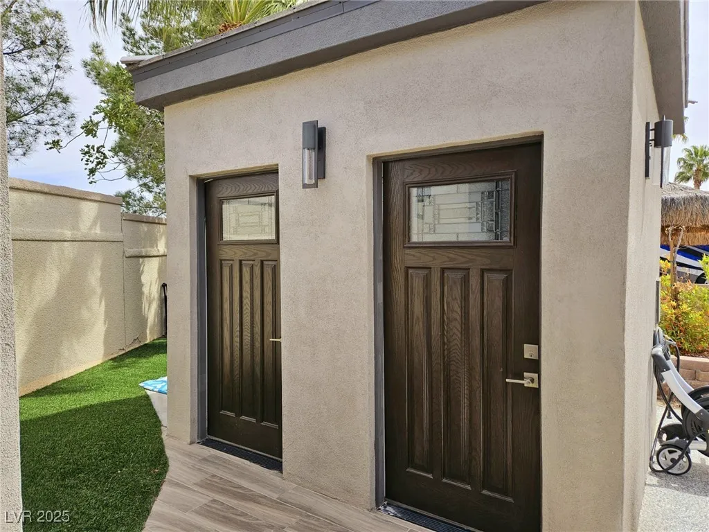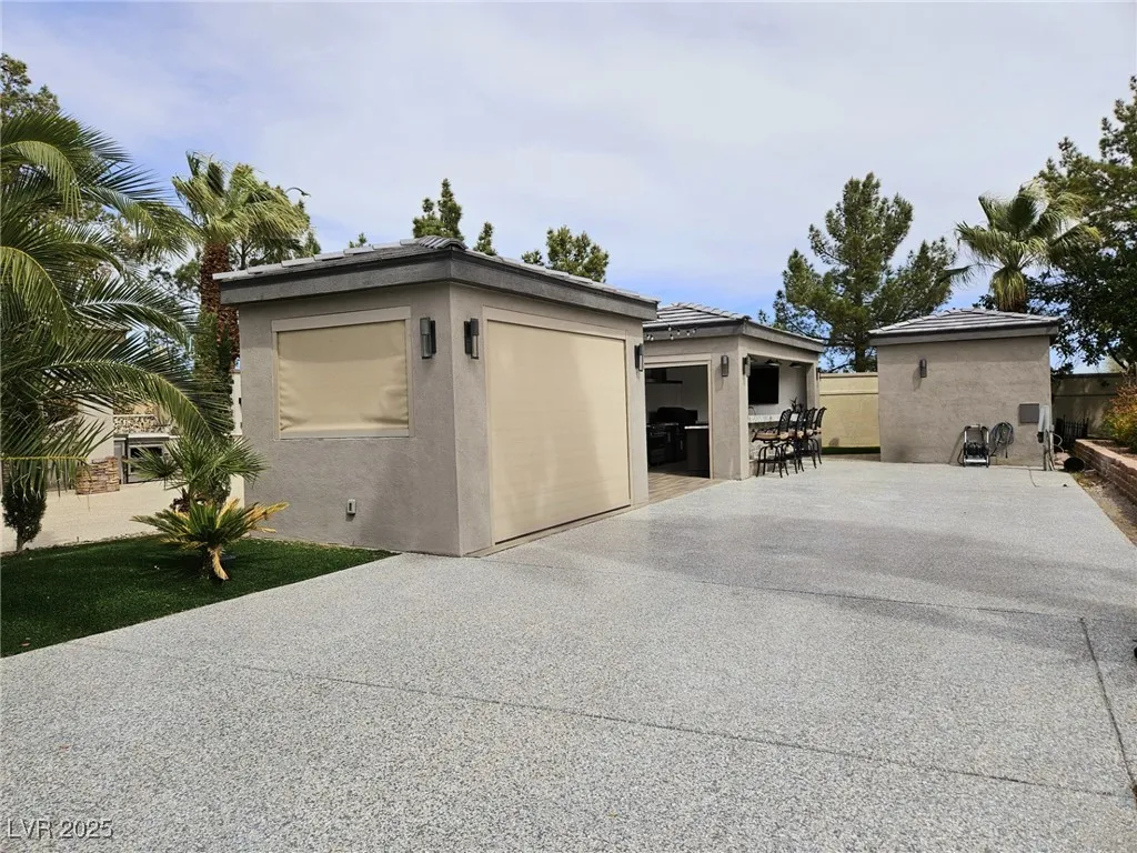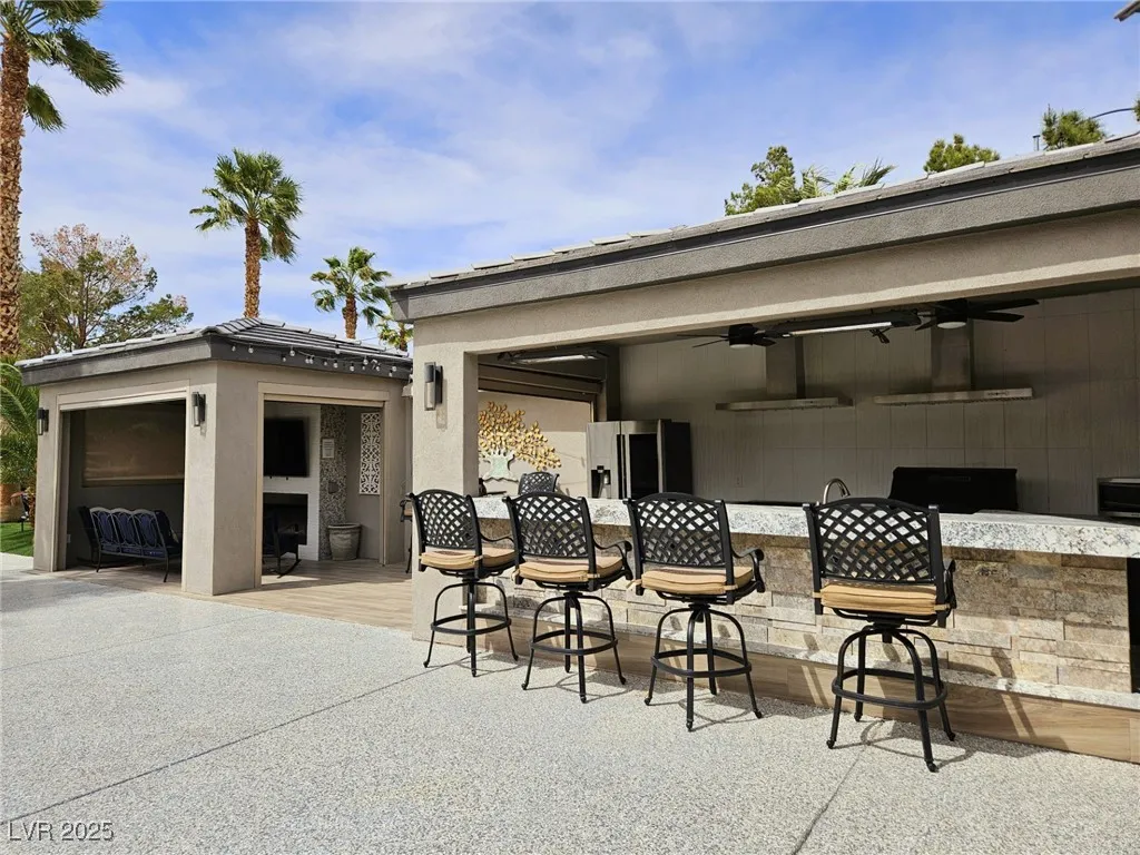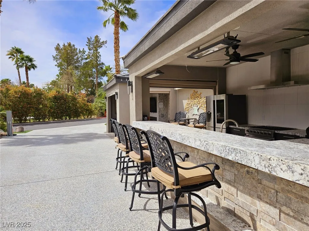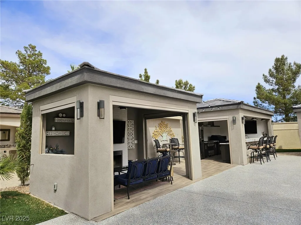Located within the Class A Las Vegas Motorcoach Resort, this site is spectacular in every sense of the word! This site has it all including three hard roof structures, motorized shades, gorgeous stone, and granite, living room area with ceiling heaters, TV & fireplace, gourmet kitchen with ceiling heaters, fans, huge bar seating, buffet table, 80” TV, Viking appliances, Samsung refrigerator, motorized awning, comfort station, washer/dryer, water softener, storage room, upgraded flooring, and so much more!