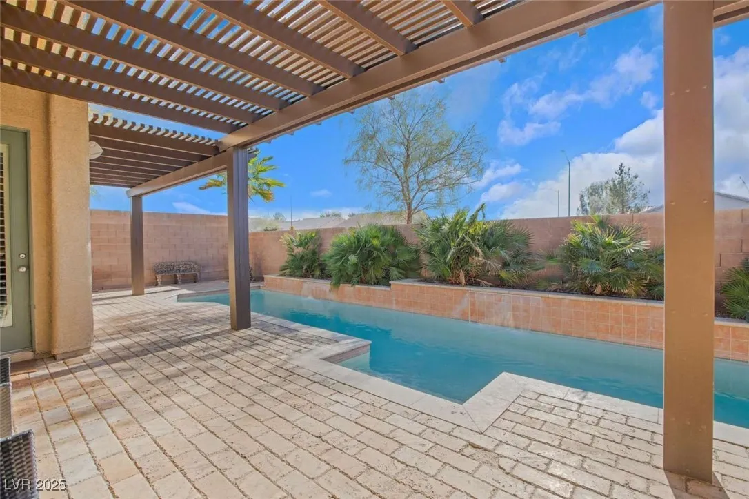 Rare privacy in a gated Henderson community – this 5-bedroom, 3.5-bath executive home in Indigo Run sits on a generous lot with only one neighboring home, giving you the feel of an estate without the maintenance. Located in the Foothills, the community is small, quiet and welcoming. From the moment you arrive, the custom iron-and-glass entry door sets the tone. Inside natural travertine floors flow throughout the main level, complemented by rich hardwood upstairs, upgraded crown molding, and plantation shutters on every window. There is a 50 ft salt water lap pool, pergola and palapa with pavers in the resort backyard. The kitchen is a true entertainer’s hub – expansive, open and built for gatherings. Three-car garage. No neighbors except on one side. There is ATV access to the Lake Mead Park National park area and unique restaurants on Water Street and in Boulder City. This is a turnkey home for buyers who want quality finishes without the compromise.