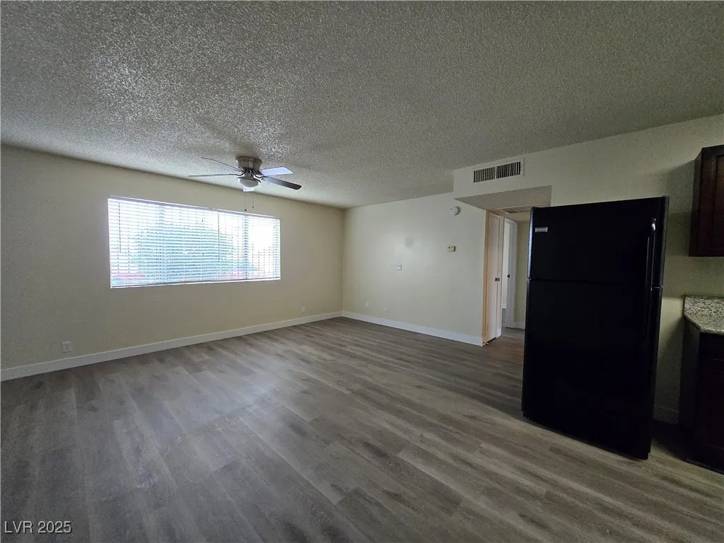 vinyl flooring. The kitchen comes fully equipped with a fridge, stove/oven, and microwave.