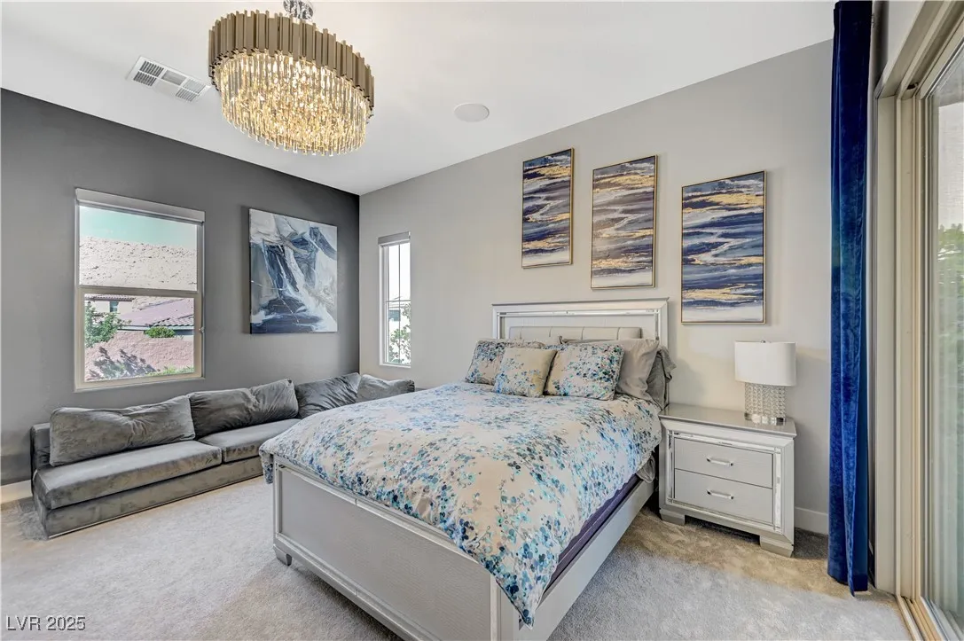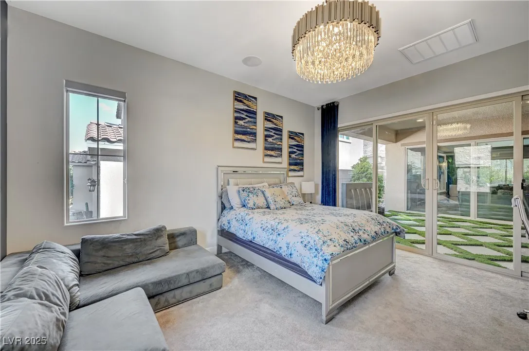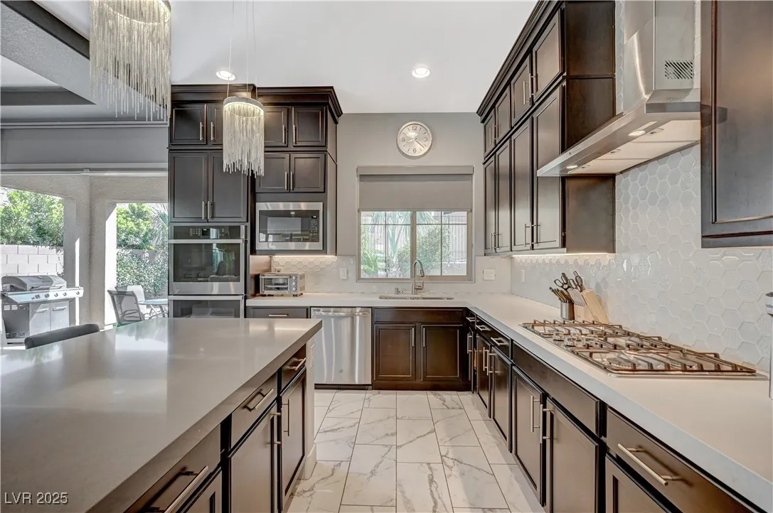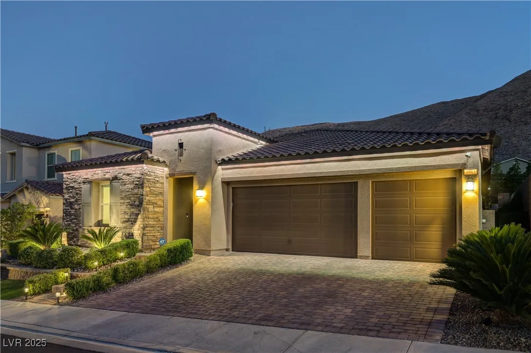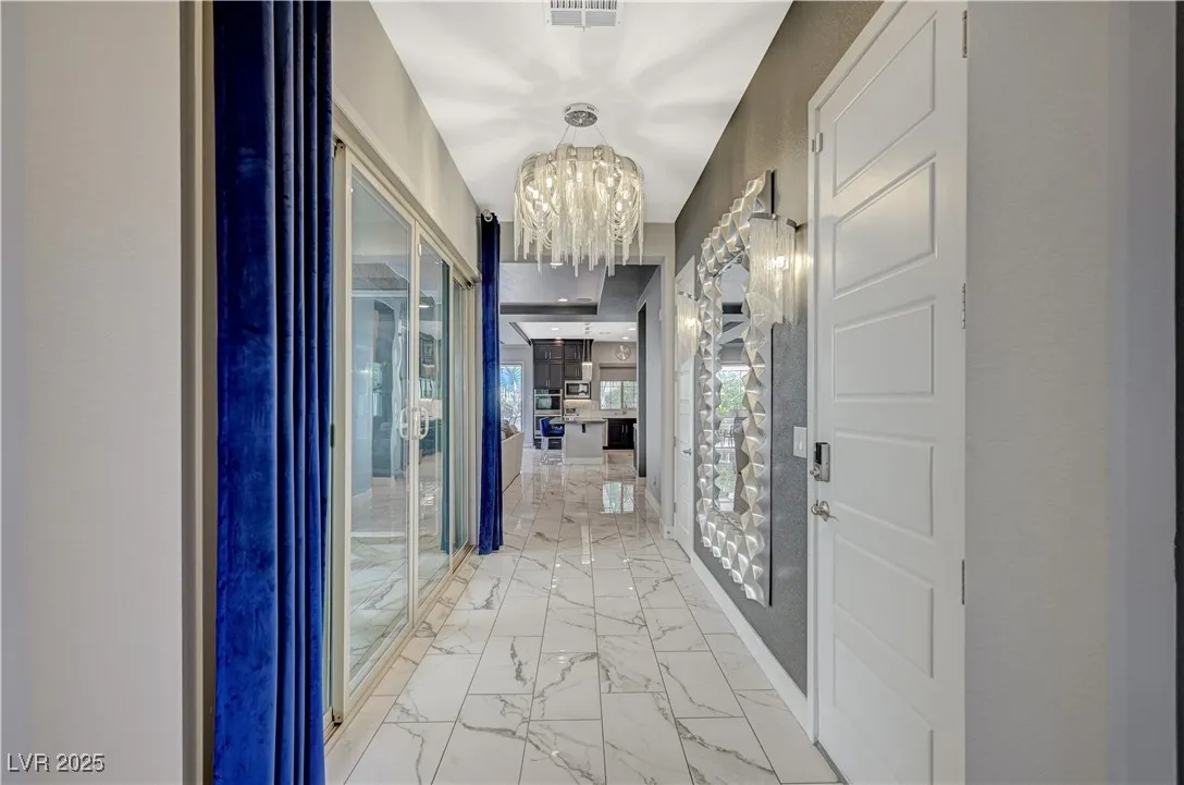 Located in the prestigious gated community of Southern Highlands, this single-story home showcases the coveted Woodside Bellini floor plan with extraordinary upgrades. The chef’s kitchen is a true centerpiece with ceiling-height custom cabinetry, an oversized quartz island, glass tile backsplash, custom vent hood, pendant lighting, and premium hardware. Expansive center-opening and stacked sliders connect the living spaces to the outdoors, where recessed ceilings, designer wallpaper, a custom mural with integrated lighting, and elegant chandeliers set the tone for modern luxury. The opulent primary suite features a custom walk-in closet and a spa-inspired bath with quartz countertops, upgraded tub/shower, and designer finishes. Outdoors, enjoy your private retreat complete with a custom pool, professional landscaping, fruit trees, courtyard fountain, artificial turf, and landscape lighting. With upgraded doors, custom closets, and details throughout, this home defines refined living.