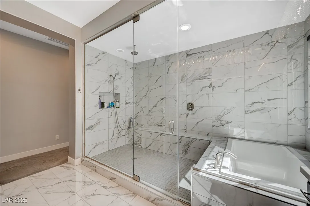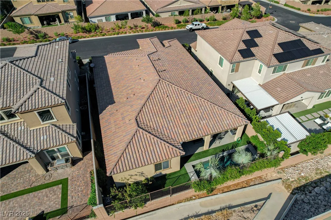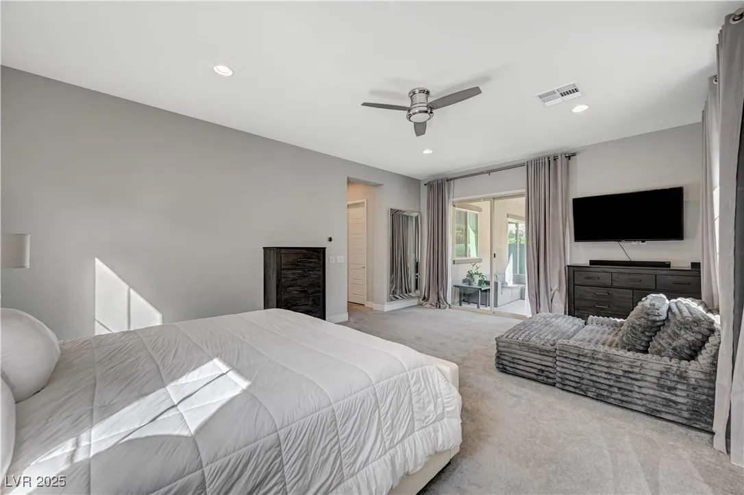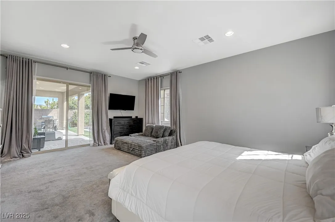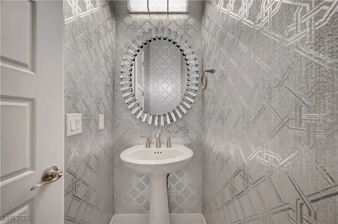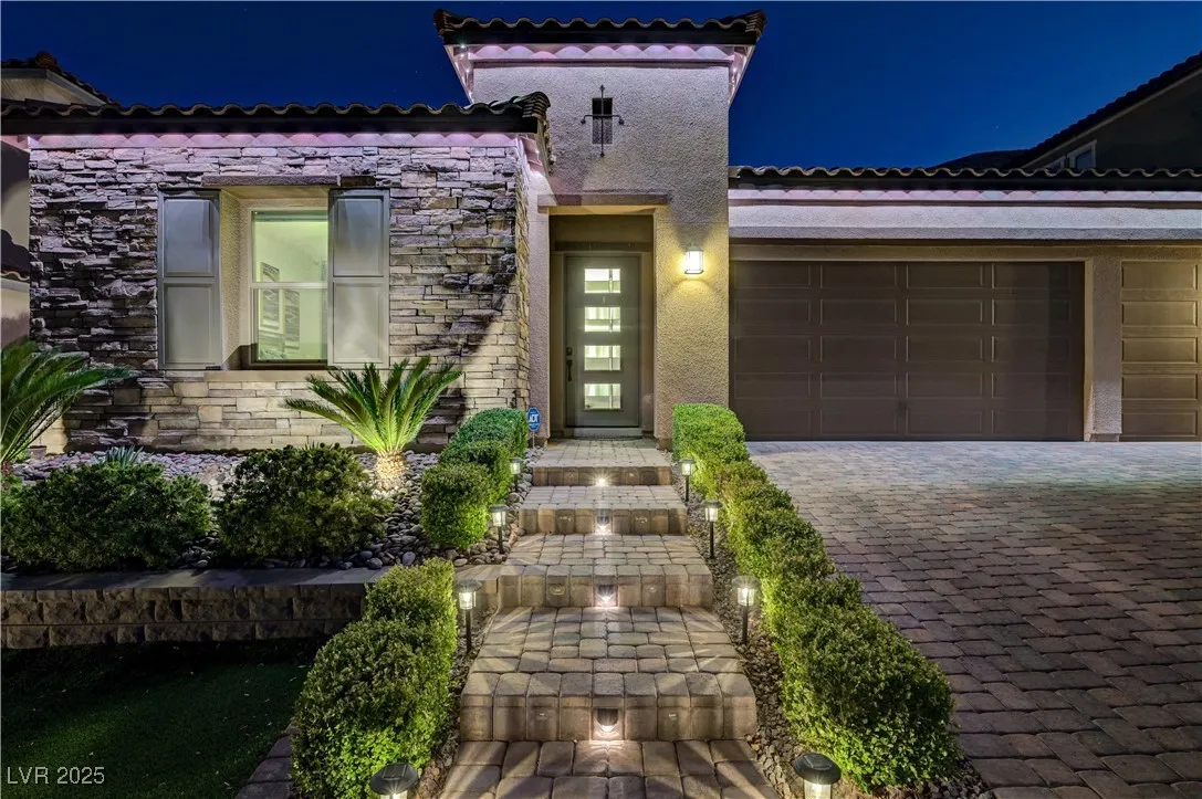 Located in the prestigious gated community of Southern Highlands, this single-story home showcases the coveted Woodside Bellini floor plan with extraordinary upgrades. The chef’s kitchen is a true centerpiece with ceiling-height custom cabinetry, an oversized quartz island, glass tile backsplash, custom vent hood, pendant lighting, and premium hardware. Expansive center-opening and stacked sliders connect the living spaces to the outdoors, where recessed ceilings, designer wallpaper, a custom mural with integrated lighting, and elegant chandeliers set the tone for modern luxury. The opulent primary suite features a custom walk-in closet and a spa-inspired bath with quartz countertops, upgraded tub/shower, and designer finishes. Outdoors, enjoy your private retreat complete with a custom pool, professional landscaping, fruit trees, courtyard fountain, artificial turf, and landscape lighting. With upgraded doors, custom closets, and details throughout, this home defines refined living.