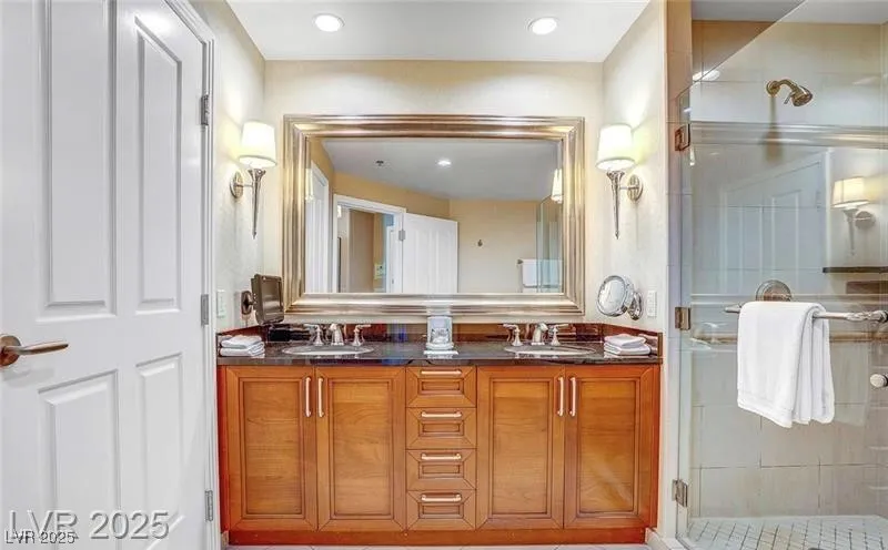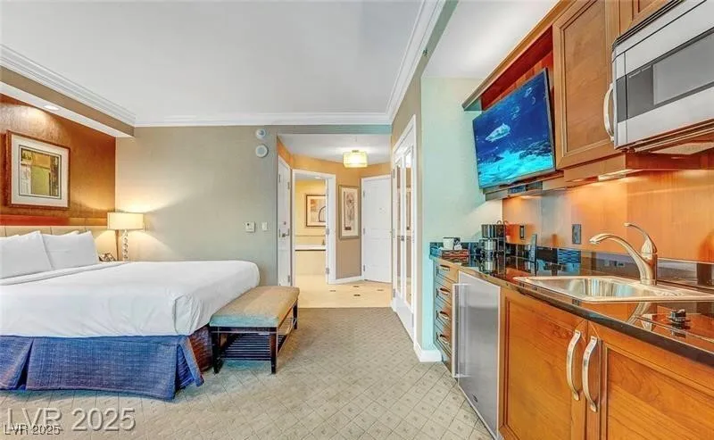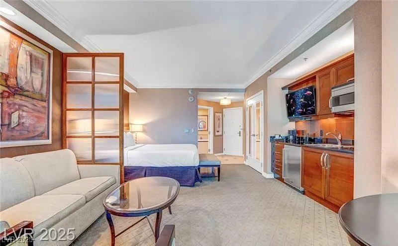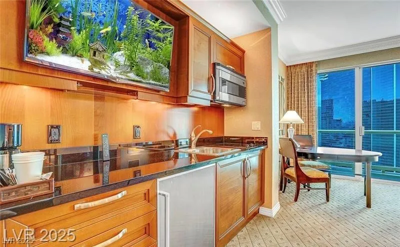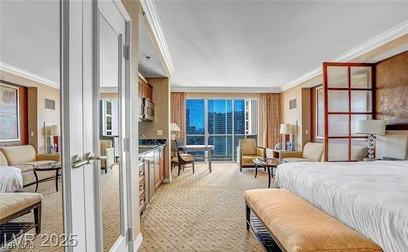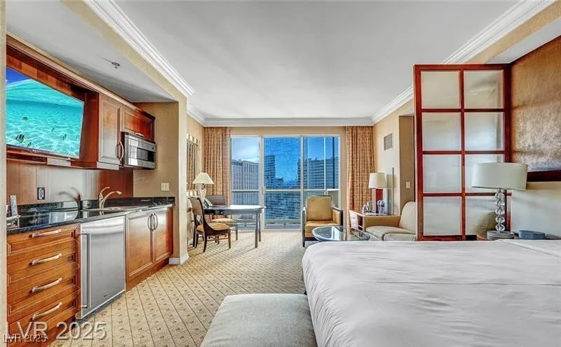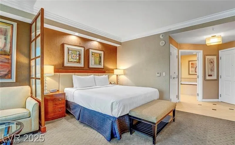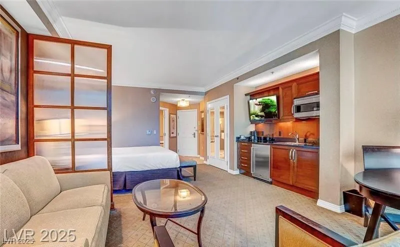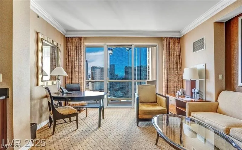 On the 25nd floor of The Signature at MGM Grand, nestled high above the dazzling lights of Las Vegas, lies a penthouse condo featuring a terrace with views of the mountains and the Las Vegas Strip! This fully furnished condo is elegantly designed to provide comfort and sophistication. The Kitchenette boasts stainless steel appliances and granite counter tops! The primary bathroom features a walk-in shower and a jetted bathtub where you can unwind after a day of exploring the vibrant city! Residents of this exclusive penthouse enjoy access to a host of world-class amenities! Dive into one of the sparkling pools or maintain your fitness routine at the state-of-the-art fitness centers. With concierge services and valet parking, your every need is catered to with exceptional care. The Signature at MGM Grand also offers a prime location, placing you just moments away from the excitement of the Las Vegas Strip! Indulge in fine dining, upscale shopping and entertainment, all within reach!