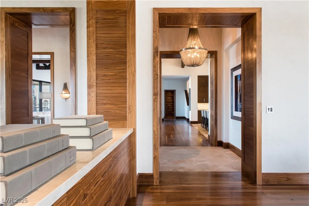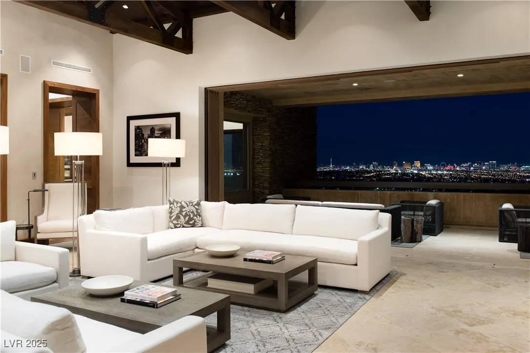 Spectacular home perched high above the city with stunning 360-degree views of The Strip, Vegas Valley & surrounding mountains from every window. This nearly 15,000 sq ft home recently underwent an exquisite $6 million renovation of the finest standard and is in one of the most prestigious neighborhoods in Vegas: triple gated The Pointe enclave of The Ridges. Enjoy the utmost privacy, backing to the mountains & no surrounding neighbors. Whether you’re a true home cook or prefer a private chef, the kitchen has it all: double islands w/waterfall onyx, 3 full ovens, commercial walk-in fridge/freezer, steamer, deep fat fryer & more. Seamless indoor/outdoor living at its best with multiple pocketing door systems, huge balcony w/dining & full outdoor kitchen. Gorgeous primary suite w/more views, two enormous closets, lounge, sauna, yoga studio, steam shower, soaking tub & private outdoor bath. Other features: state-of-the-art movie theater, game room, loft area, neg-edge pool & much more.