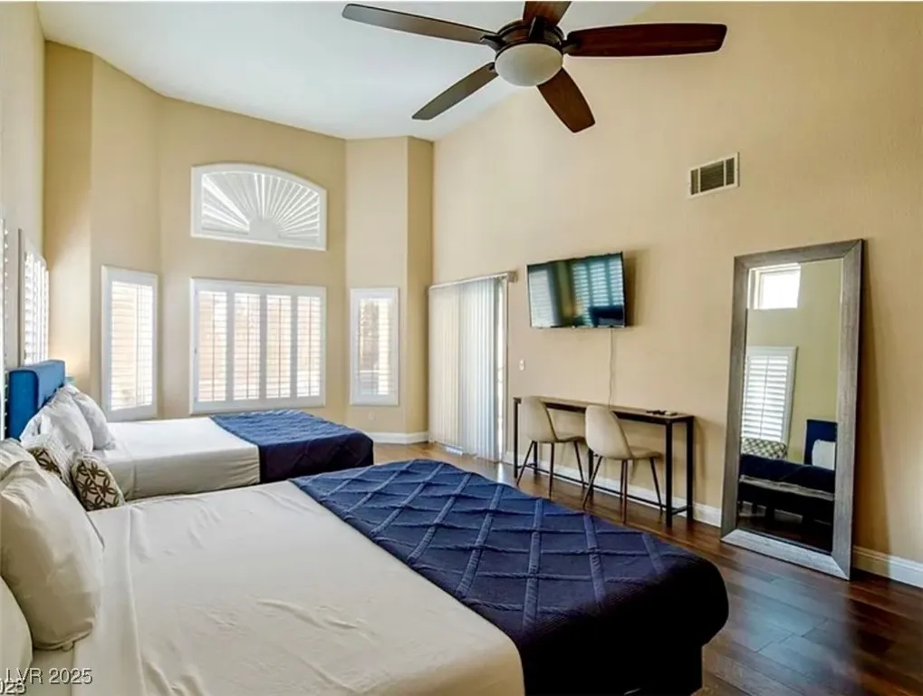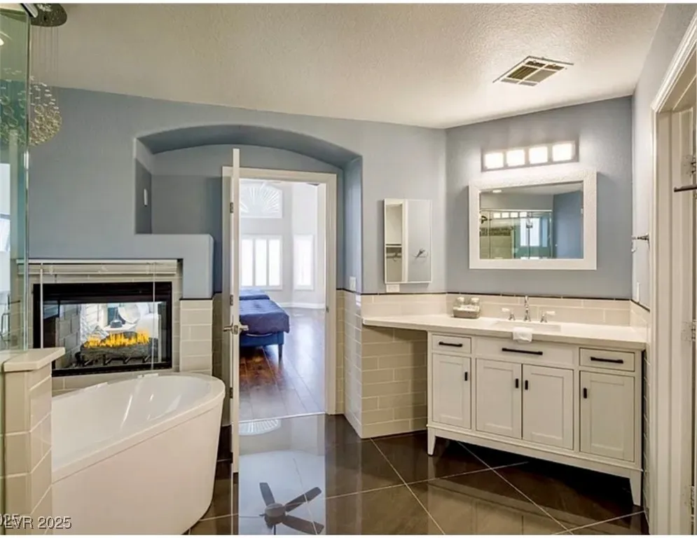 LUXURIOUS POOL PROPERTY IN PRIME LOCATION! Open, airy floor plan w/ modern tasteful finishes and the perfect blend of private and shared spaces. Chef’s kitchen has double oven, walk-in pantry, HUMONGOUS island w/ gorgeous quartz, opens to spacious living/dining room, bathed in natural light, with cozy fireplace and lofty ceiling. Perfect for entertaining or just relaxing with loved ones. Primary bedroom is downstairs and boasts a two-way fireplace shared with the spa-like primary bath. Both bedroom and main living space have doors leading to a backyard oasis w/ sparkling pool and hot tub, HUGE covered patio, west-facing for sunset sky views. Three-car garage for your toys. Solar panels for low, low power bills. Located on a neighborhood cul-de-sac, yet minutes from Green Valley Ranch, The District, Harry Reid International Airport, The Strip, shopping, dining, parks, schools. Property will be available for move-in approx June 1st.
