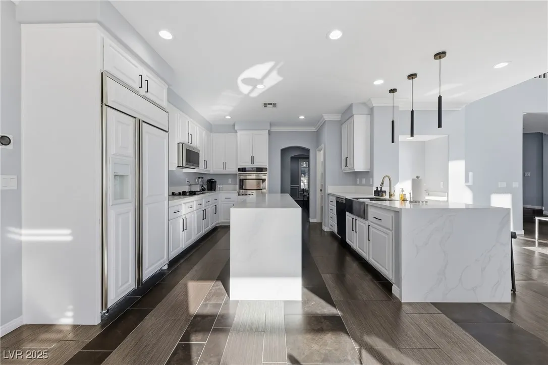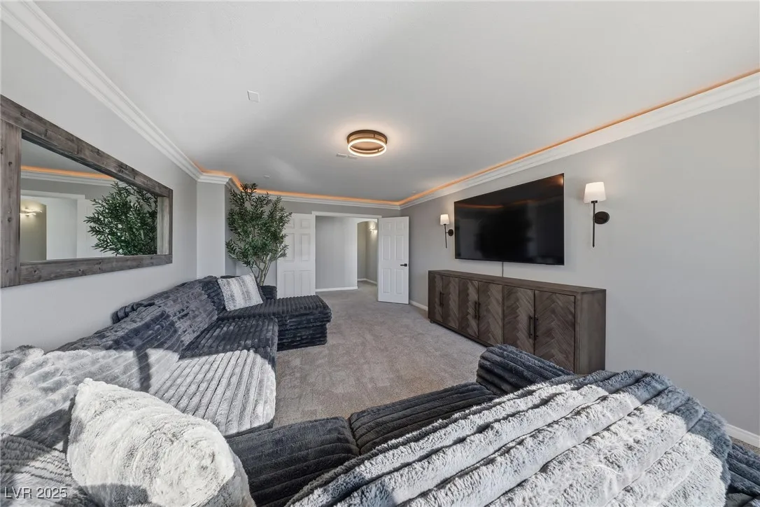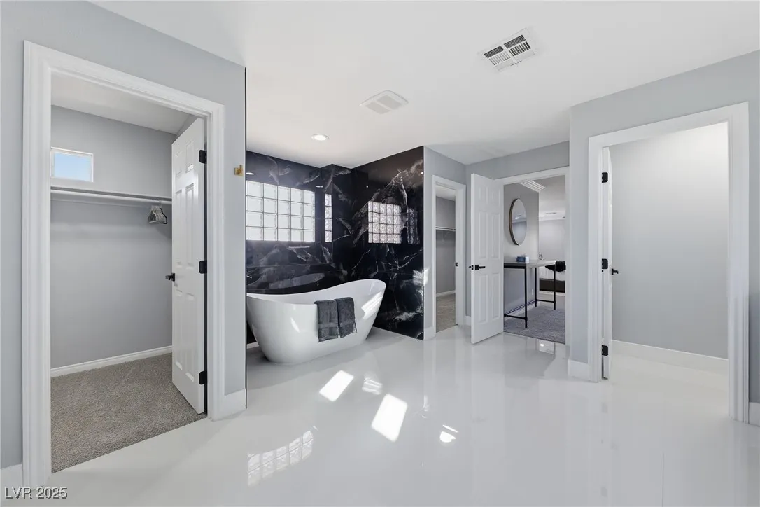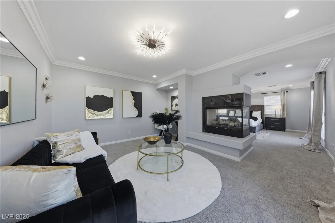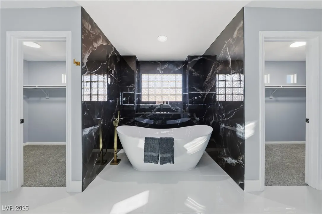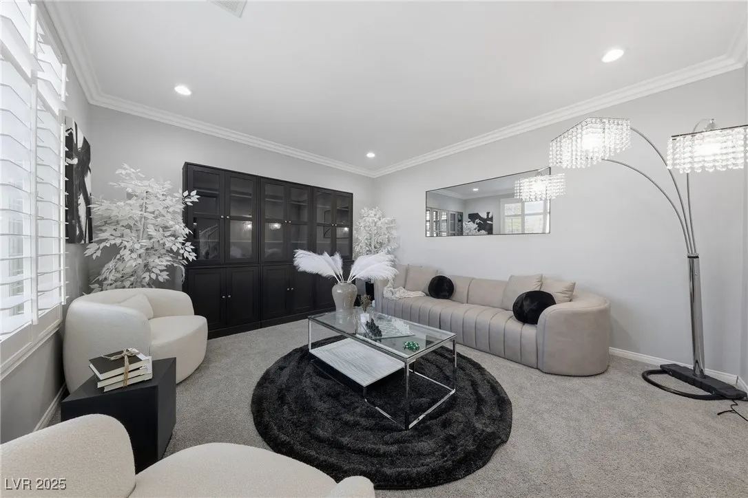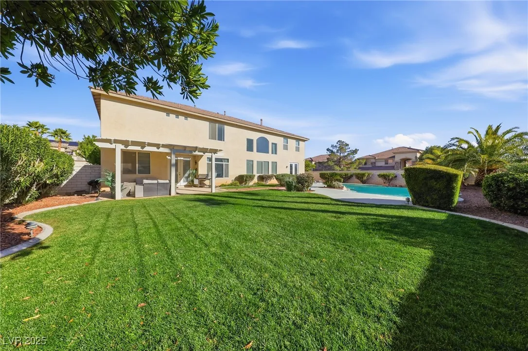 WOW! Exquisite nearly 5,000 sq. ft. residence in Spring Mountain Ranch. From the soaring foyer to the stunning great room, this home radiates modern luxury. Sleek marble accents, designer lighting, and custom built-ins elevate every inch. The open layout flows into a chef-style kitchen and chic dining area, perfect for entertaining. Enjoy two elegant primary suites—one with a private balcony and lounge—plus beautifully curated living spaces that blend style, comfort, and total sophistication. The moment you walk in, you’ll feel the “wow” factor. Fully furnished including linens, and a well-stocked kitchen. Flexible rental terms starting at $7,950/month for a one-year lease which includes pool and landscape maintenance; shorter stays available with utilities included.