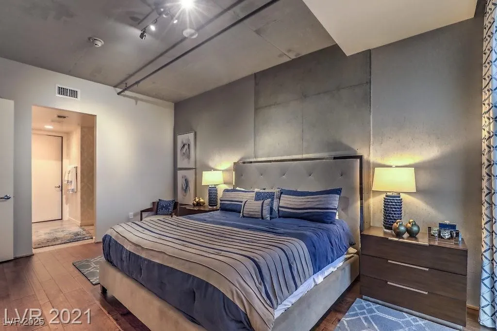 Iconic Las Vegas Strip & City/Mountain views from this renovated fully furnished 2 bedrooms, 2 baths condo w/floor to ceiling windows. Over 1200 sq ft located on 6th flr w/terrace overlooking Downtown LV & Arts District! Walking distance to all courts & Premium Outlets. Condo is fully furnished, includes pots, pans, glassware, dishes, linens. Condo features hardwood flrs, concrete walls, kitchen with quartz counters, matching tile backsplash & SS appls. Primary bedroom has floor to ceiling windows allowing tons of natural light, huge walk in closet & double vanities in Primary Bath. Building features Resort style pool w/poolside cabanas, spa fire pit, alfresco movie theatre, 10th floor wine deck with Strip Views, pet park, two story fitness center, summer kitchens, & grilling areas, 24 hr security, on-site dry cleaning, vehicle charging stations, parking, business center, concierge & much more. Ground floor offers craft retail, downtown corner store, Greens & Proteins with more coming