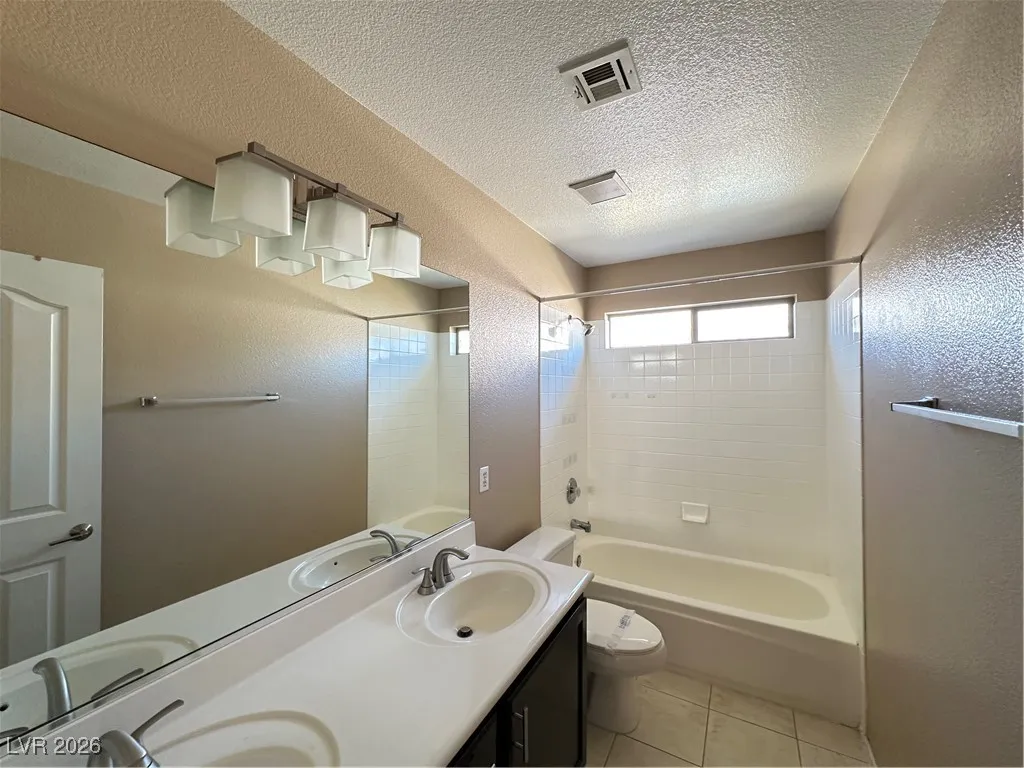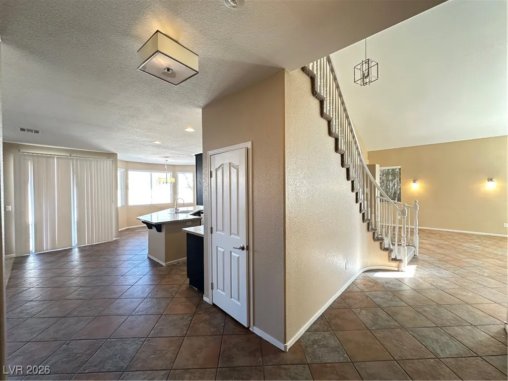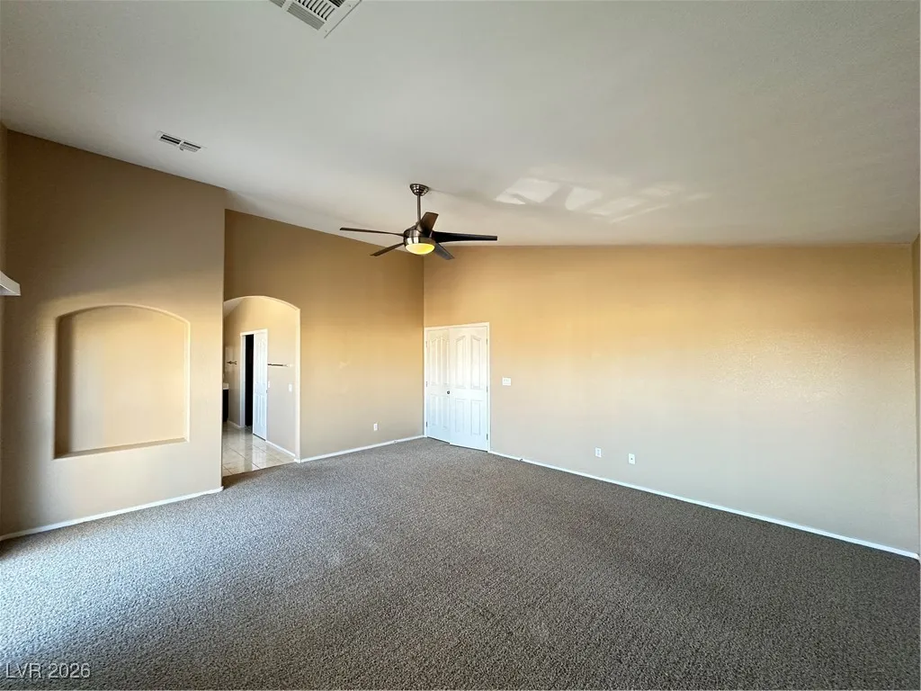 Attractive and spacious 5 bed, 3.5 bath home in desirable Summerlin featuring an open floor plan with vaulted ceilings and tile/carpet throughout. Downstairs includes separate living room, family room, and den. Kitchen offers stainless steel appliances, walk-in pantry, and breakfast bar/island. Primary suite includes double sinks, soaking tub, walk-in shower, and balcony access with great views. Upstairs loft provides additional living or office space. Large backyard with with mature landscaping that also includes a covered patio. Price includes $50 a month for trash and sewer.