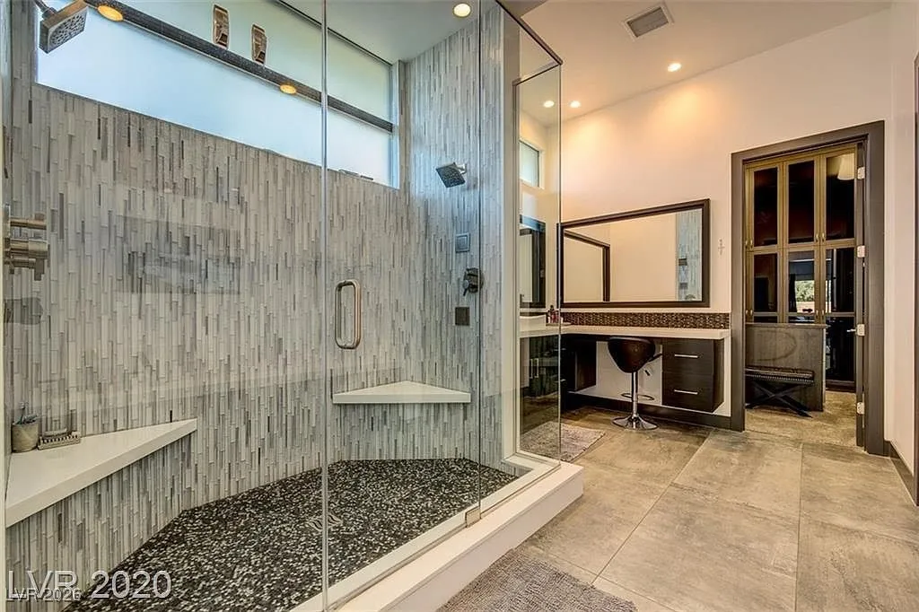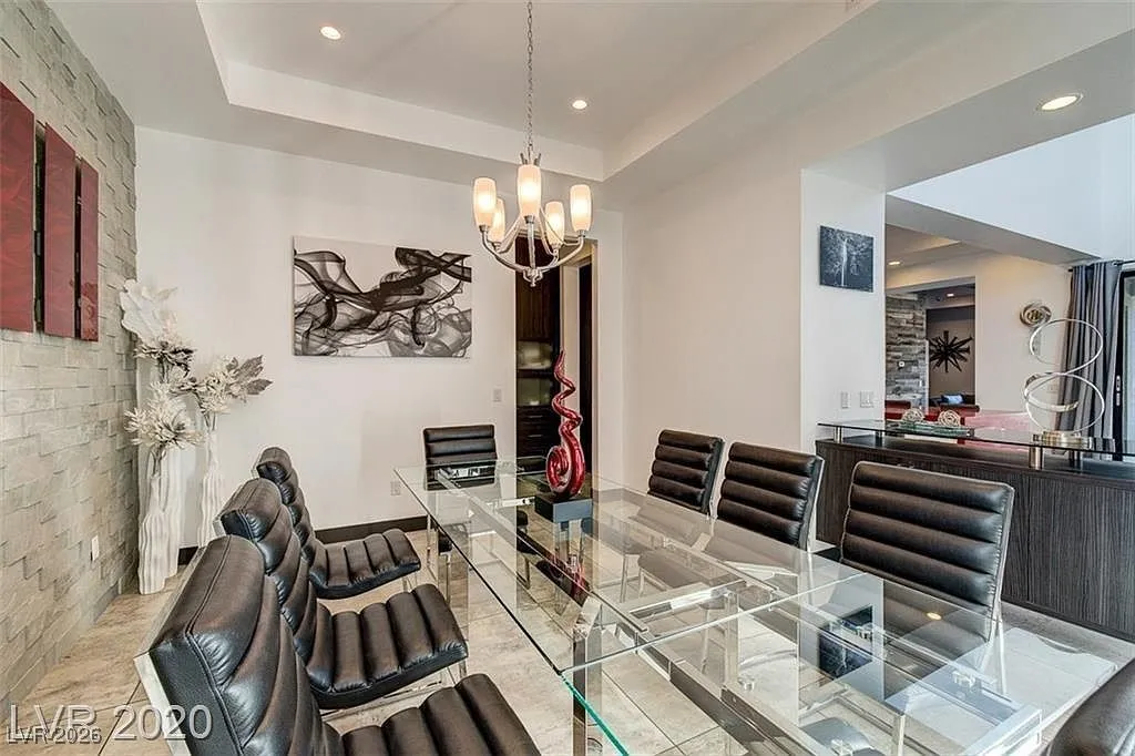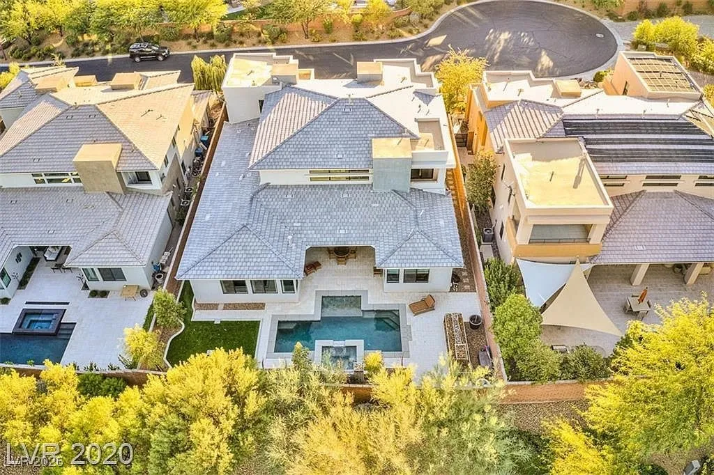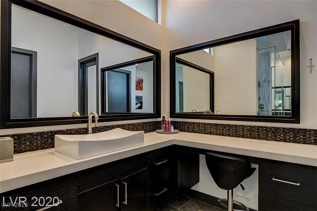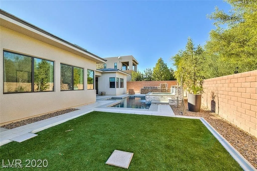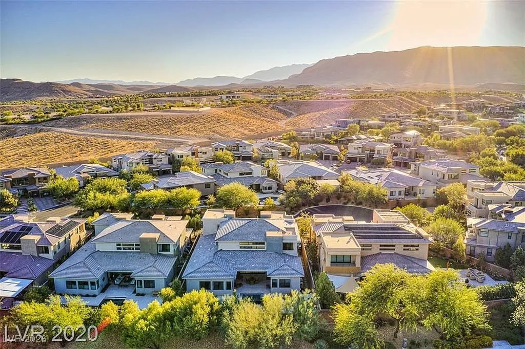FURNISHED stunning semi-custom William Lyon home on a private cul-de-sac lot in Sterling Ridge at The Ridges. This gorgeous home features 5 ensuite bedrooms, with the primary and one guest suite located downstairs. Each bedroom boasts high-end custom closets with built-ins. Floor-to-ceiling glass pocket doors lead to a spacious covered patio and pool/spa, creating a seamless indoor/outdoor flow, perfect for entertaining. The modern design includes an incredible open space and a gourmet kitchen with a large island/breakfast bar, top-of-the-line Wolf and Subzero appliances, a cozy nook, and a formal dining room. The downstairs master suite features a cozy fireplace, a luxurious master bath with a jetted tub, and a private patio. Upstairs balconies provide partial Strip views, while the backyard offers a refreshing swimming pool, spa, water feature, low-maintenance landscaping, and a covered patio.