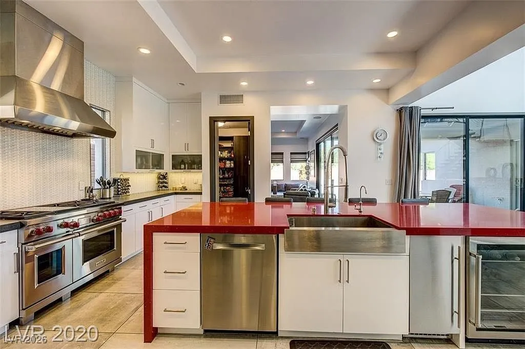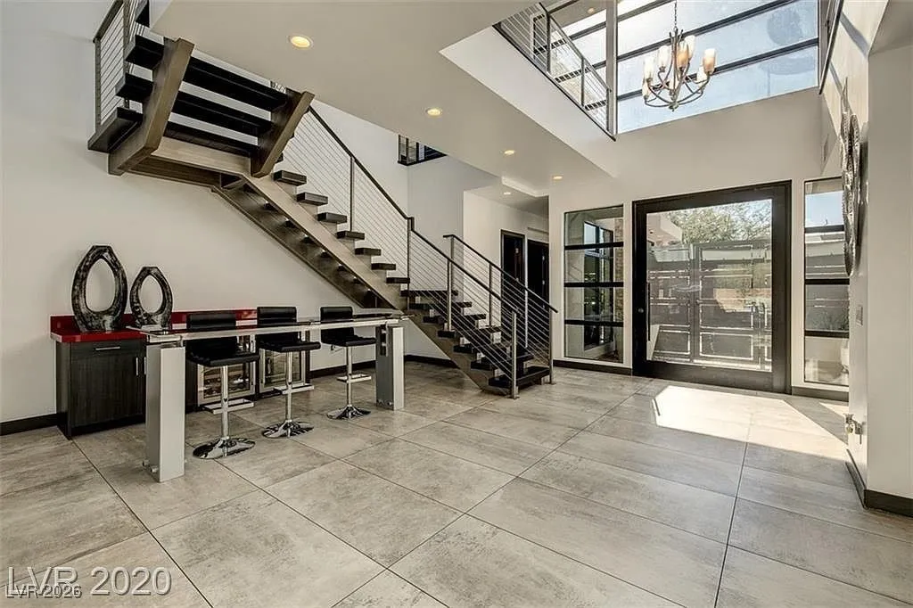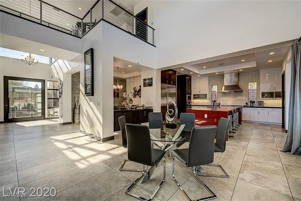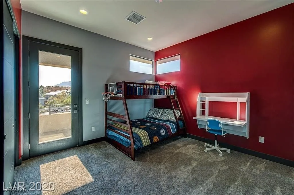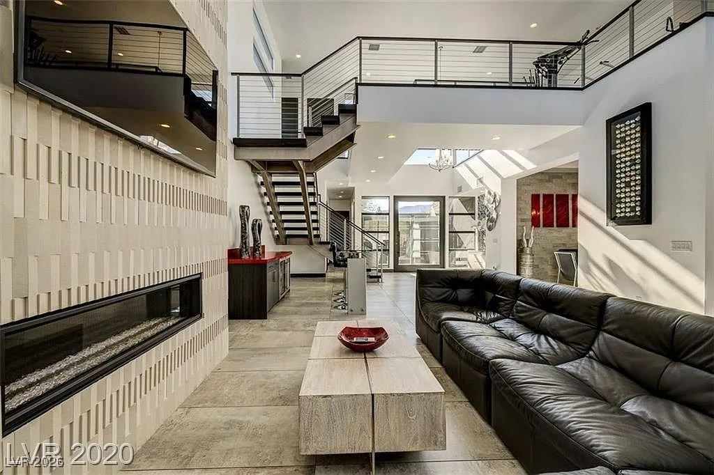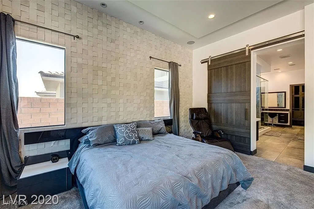 FURNISHED stunning semi-custom William Lyon home on a private cul-de-sac lot in Sterling Ridge at The Ridges. This gorgeous home features 5 ensuite bedrooms, with the primary and one guest suite located downstairs. Each bedroom boasts high-end custom closets with built-ins. Floor-to-ceiling glass pocket doors lead to a spacious covered patio and pool/spa, creating a seamless indoor/outdoor flow, perfect for entertaining. The modern design includes an incredible open space and a gourmet kitchen with a large island/breakfast bar, top-of-the-line Wolf and Subzero appliances, a cozy nook, and a formal dining room. The downstairs master suite features a cozy fireplace, a luxurious master bath with a jetted tub, and a private patio. Upstairs balconies provide partial Strip views, while the backyard offers a refreshing swimming pool, spa, water feature, low-maintenance landscaping, and a covered patio.