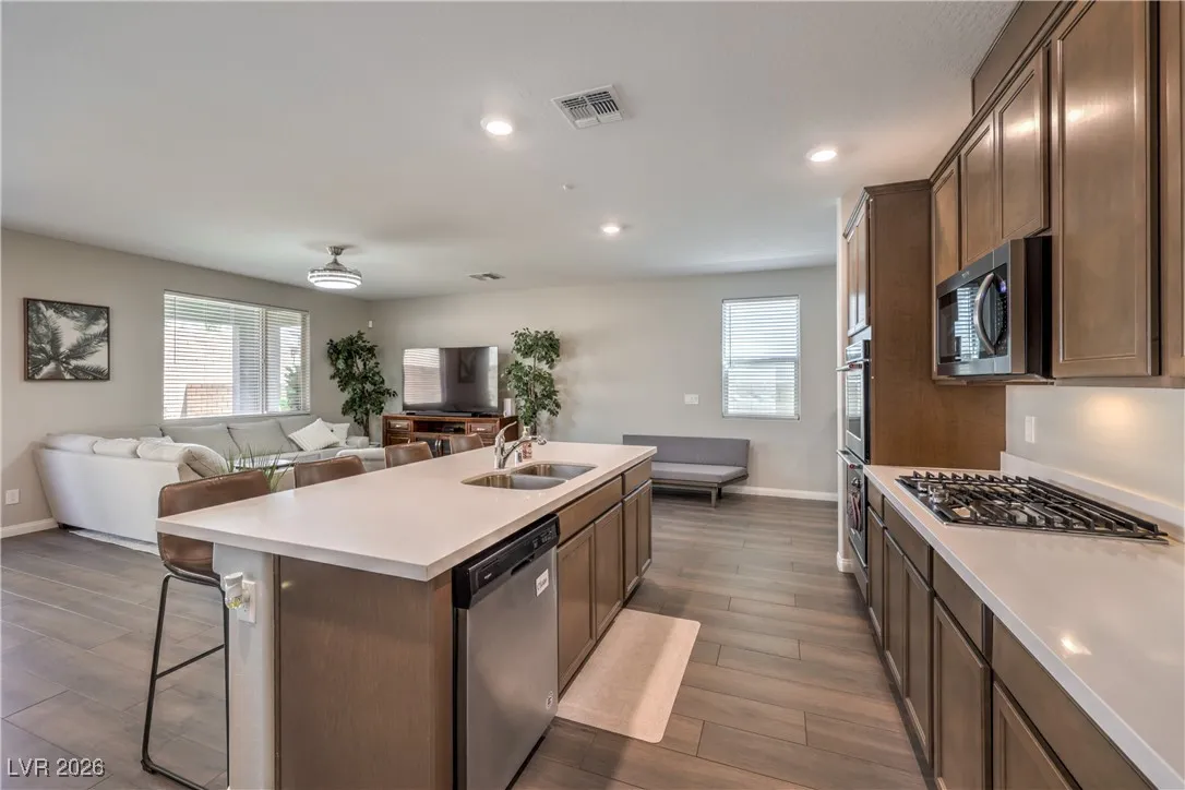 Discover luxury living in the heart of Summerlin. This highly upgraded 5 Bedroom, 4 bath home offers a warm welcome when you walk in the door. Boasting modern, high-end finishes, spacious interiors, and premium amenities, this home is perfect for those seeking a sophisticated lifestyle. The Gourmet Kitchen has elevated cabinetry, double ovens, built in stove top, high end refrigerator, and a beautiful island to bring everyone together. Enjoy the close proximity to upscale dining, world-class shopping, and vibrant entertainment options, all just minutes away. Nestled in a serene, well-maintained community, this property provides both tranquility and easy access to the best Summerlin has to offer.