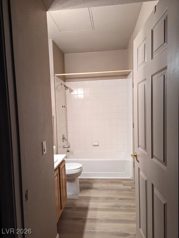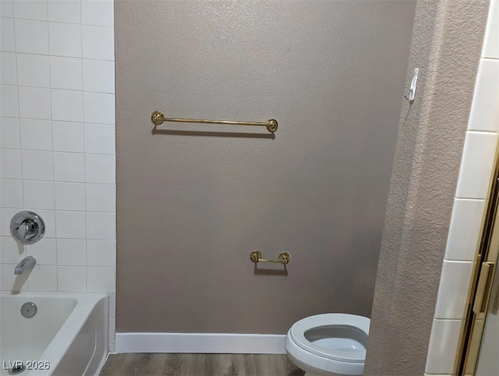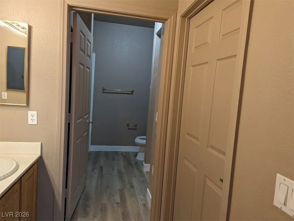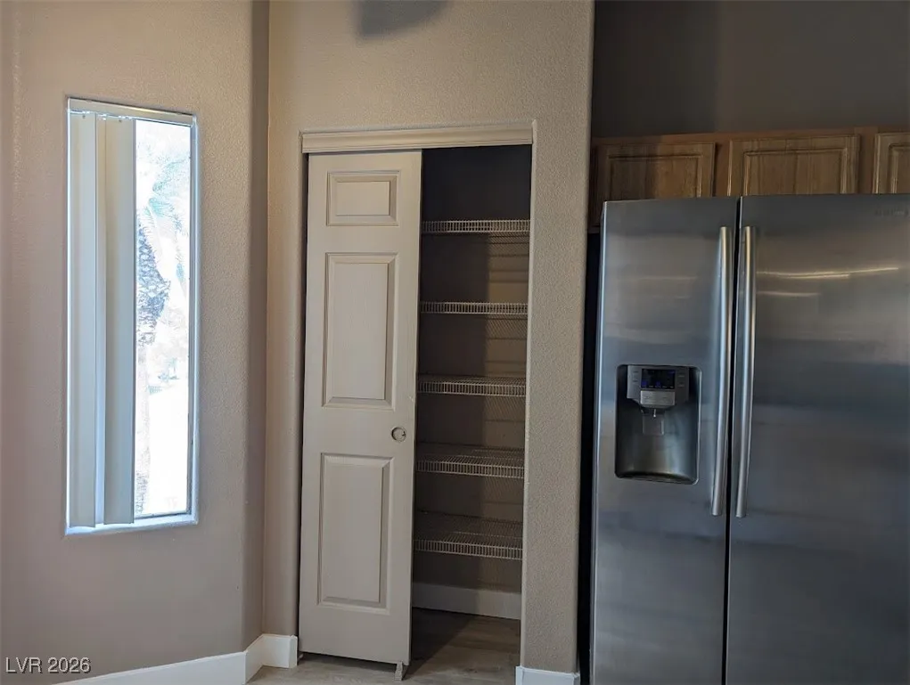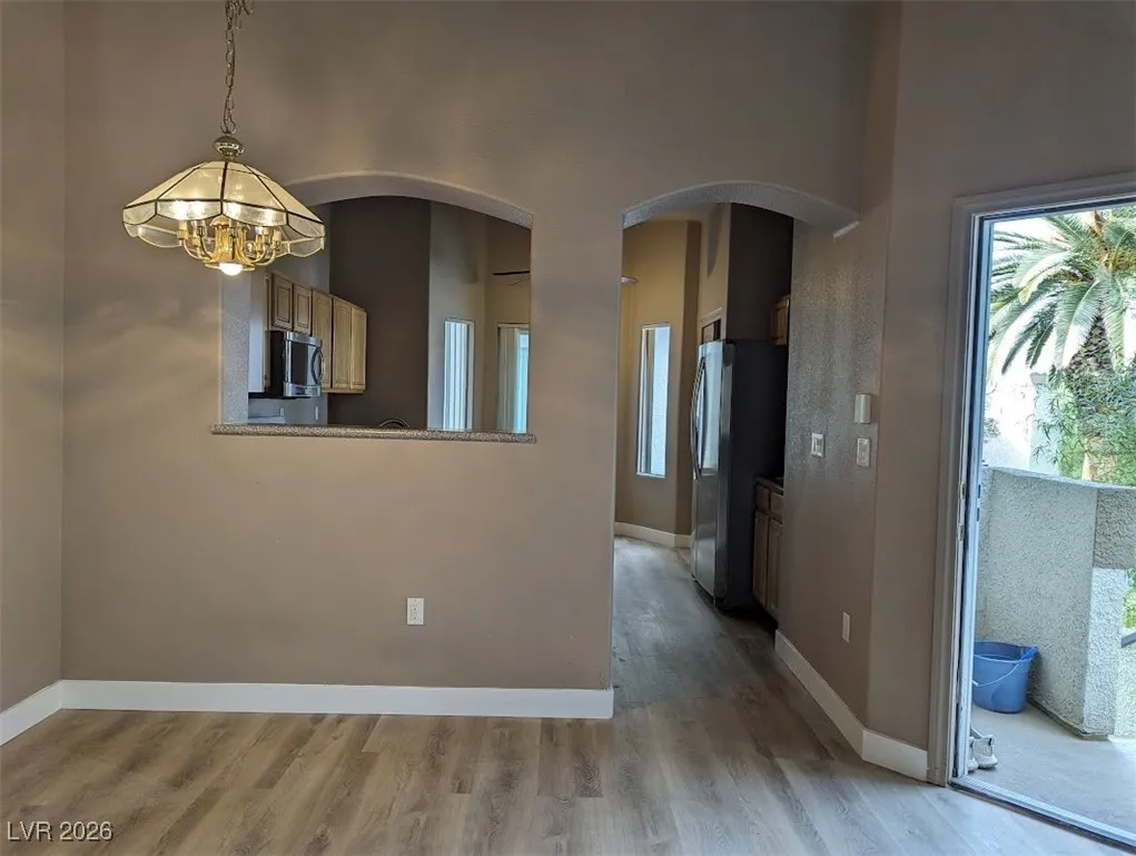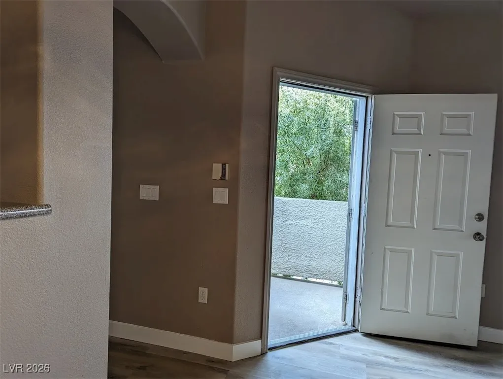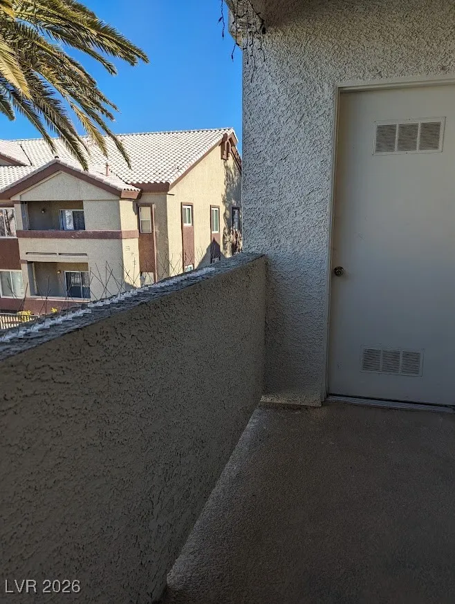 Balcony off of living-room with swimming pool view and storage area. Newer wood like flooring.