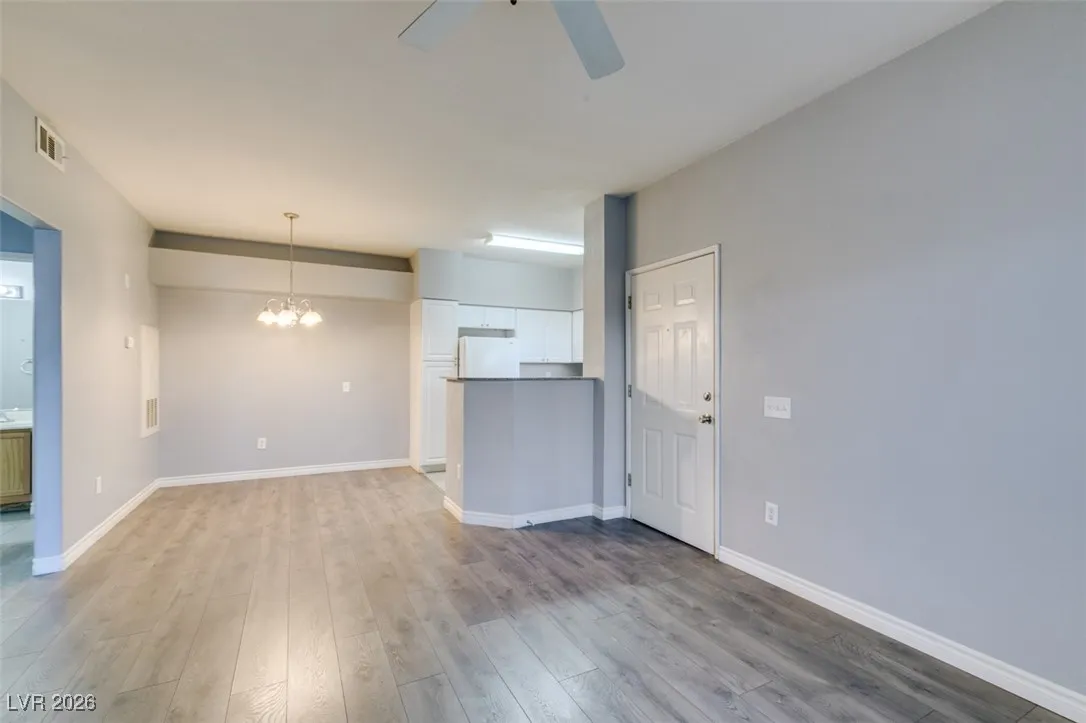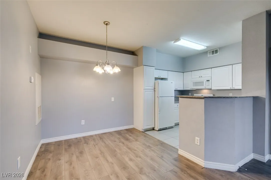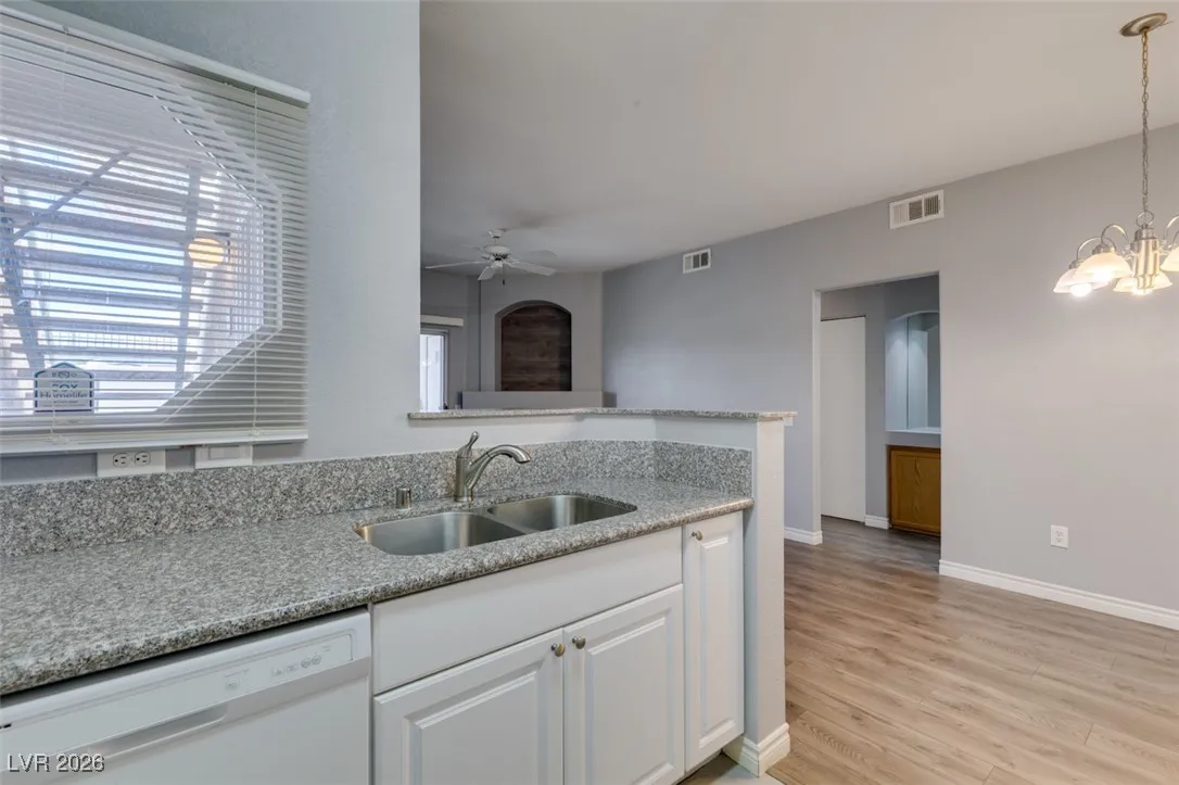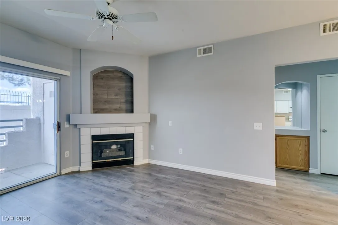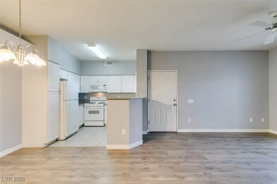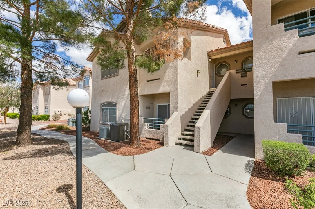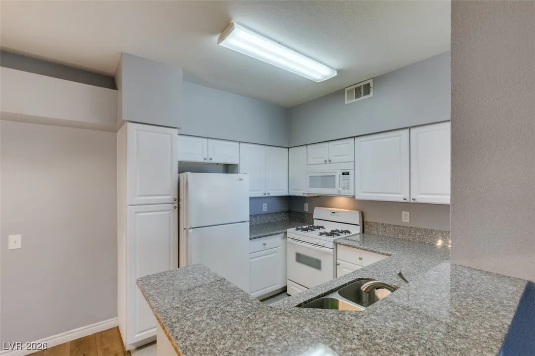 Welcome to this charming 1 bedroom, 1 bathroom home located in a gated community in Las Vegas, NV. This cozy residence features an open floorplan with laminate wood floors and a fireplace in the living room, perfect for relaxing or entertaining guests. The kitchen boasts granite counters, white appliances, a breakfast bar, and plenty of cabinet and counter space for all your culinary needs. Enjoy the community amenities including a pool, spa, fitness area, and other facilities. With freshly painted walls and a welcoming atmosphere, this home is the perfect retreat for anyone looking for comfort and convenience in a desirable location.