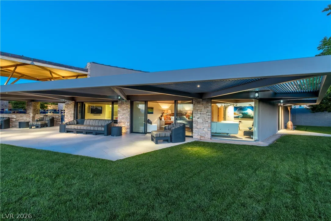 Welcome to Silver Rock, an architectural icon by acclaimed Gordon Rogers, AIA, quietly set behind double gates on a lush one-acre lot overlooking the 5th green of Anthem Country Club. This 15,000+ SF modern estate is a masterful blend of light, water, and natural elements, anchored by a dramatic central atrium with cascading water features that create a serene, resort-like ambiance. Expansive open-concept living flows beneath soaring crystalline canopy ceilings into a chef’s-grade kitchen and elegant entertaining spaces. The first-floor primary suite is a private retreat with a designer closet, steam shower, and two-person jetted tub. Three ensuite guest suites, a private casita, and a 2nd casita complement the home. Entertain at scale with a theater, game room, pub, and NCAA half basketball court. Outdoors, enjoy an infinity-edge pool, fire features, swim-up bar, and breathtaking sunset, golf course, and city-light views. A rare offering of tranquility, prestige, and timeless design.