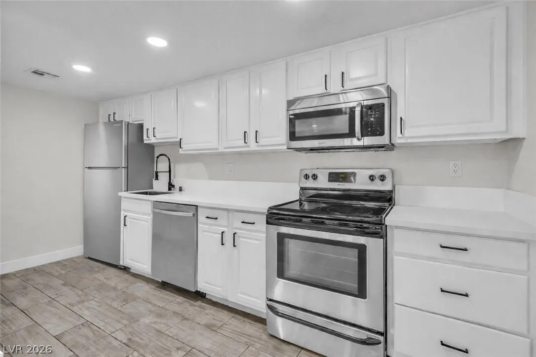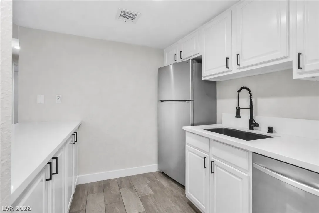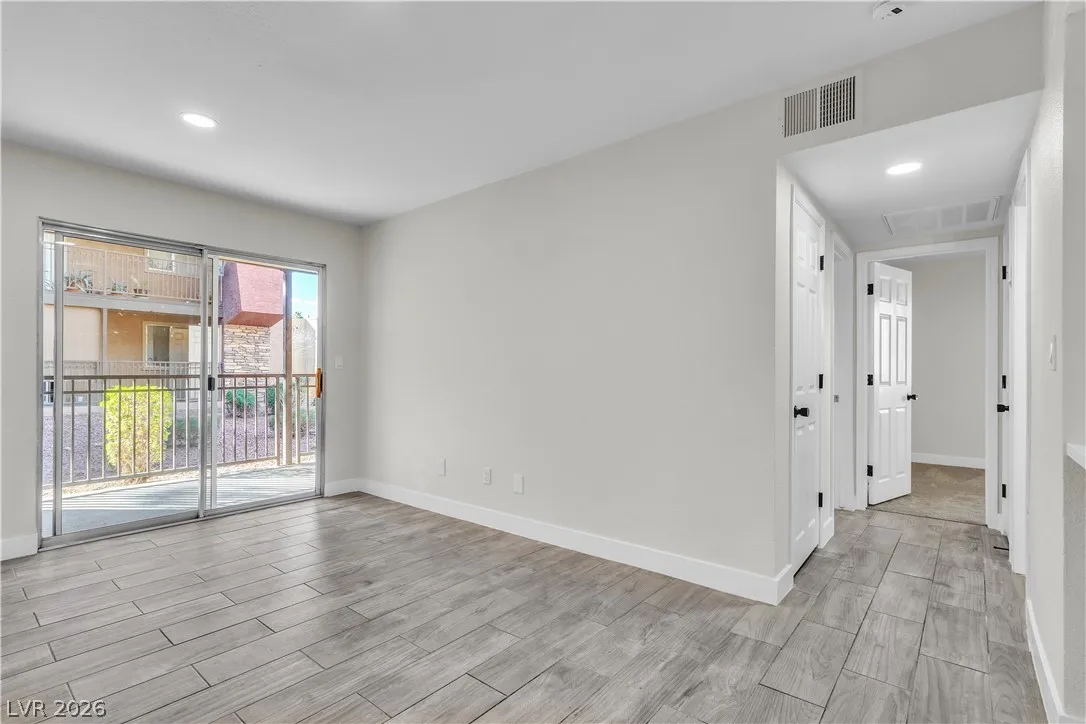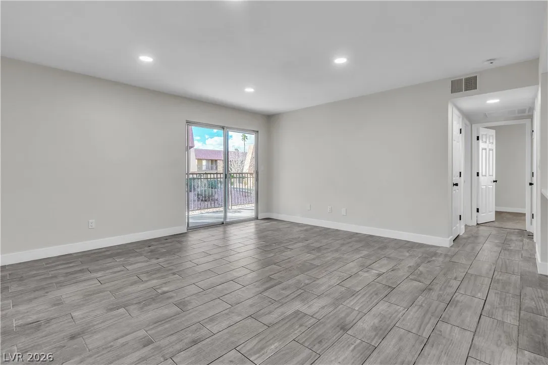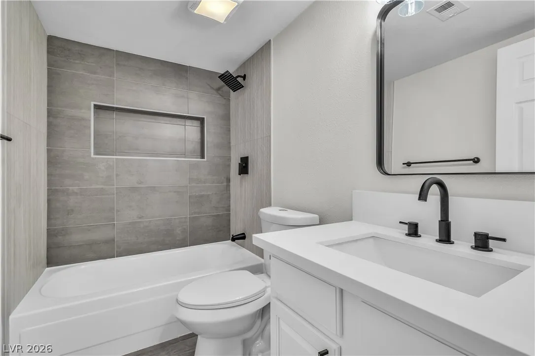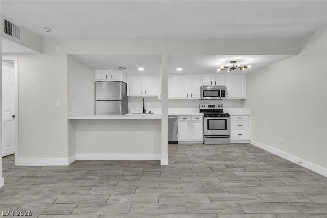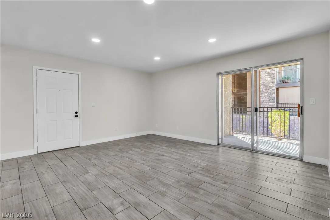 Enjoy coming home to this newly refreshed 2-bedroom, 1-bathroom condo located in the beautiful Bella Vita community! Just minutes away from the Las Vegas strip, this modern and stylish first floor unit features an open-concept layout and upgraded finishes. Step into the living area where you are greeted with wood-look ceramic tile flooring, LED lighting and fresh paint creating a warm and inviting atmosphere. The updated kitchen boasts quartz countertops, breakfast bar, stainless steel appliances, and all new fixtures. This condo has two spacious bedrooms and an updated full bathroom, with custom shower tiles. Enjoy resort-style amenities, including a pool, fitness center, clubhouse, and beautifully landscaped grounds. This prime location is just minutes from the 15 freeways, shopping, dining, and recreation.