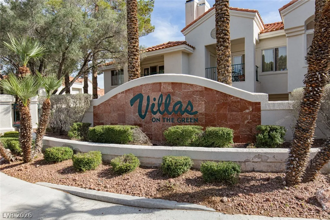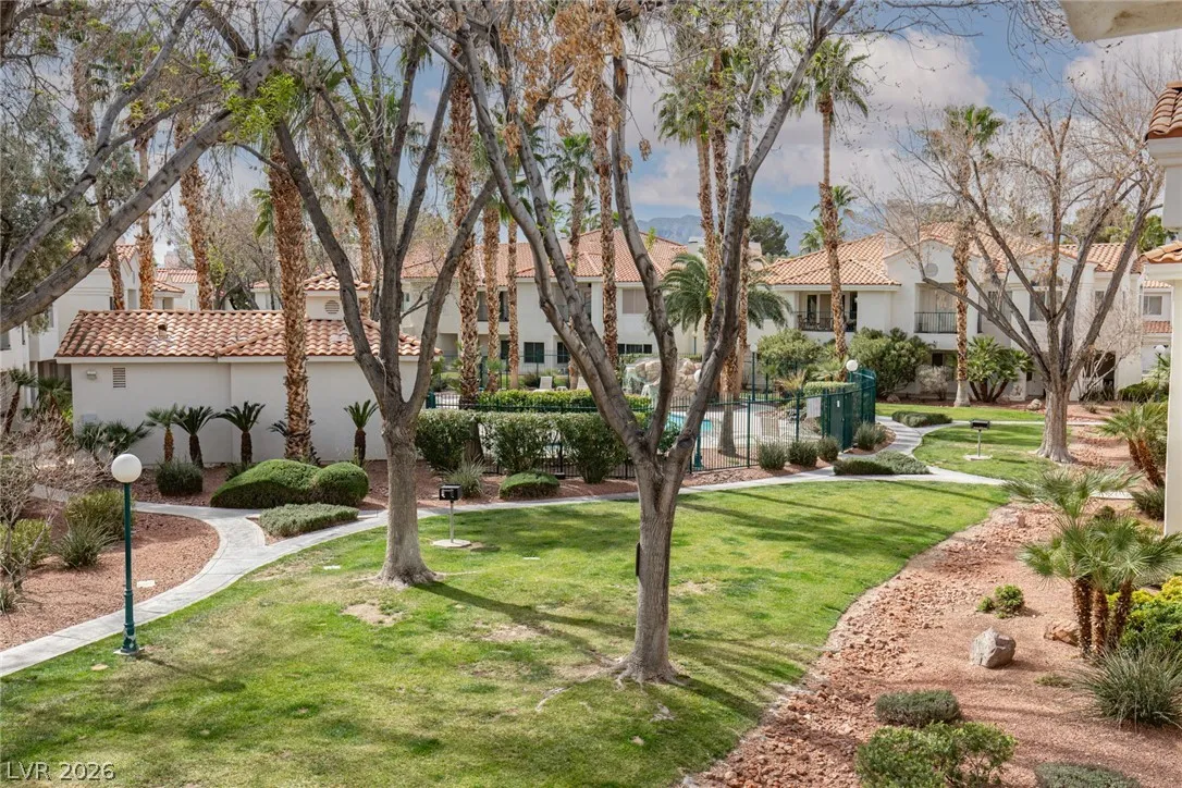 Tucked inside a double-gated enclave, this condo offers rare peace of mind and privacy. Second-floor corner unit sits inside its own private gated enclave -offering an added level of security and privacy. Inside, you’ll find wood-look ceramic tile flooring throughout and a spacious, thoughtfully designed layout. A standout feature is the expansive 16×16 den, customized with extensive upper and lower cabinetry, pull-out shelving, wine storage, and a built-in desk — ideal for a home office, library, or flex space. The kitchen, with stainless appliances and a built-in refrigerator, flows into a large living area with a fireplace and patio access, overlooking the interior grounds and offering a peek at the westside mountains. Spacious primary suite with separate tub and shower, dual sinks, and a walk-in closet. Large laundry room with sink and cabinetry. Full-size two-car garage. Community pool just steps away. Comfortable, secure, ideal for full-time living or lock-and-leave convenience.