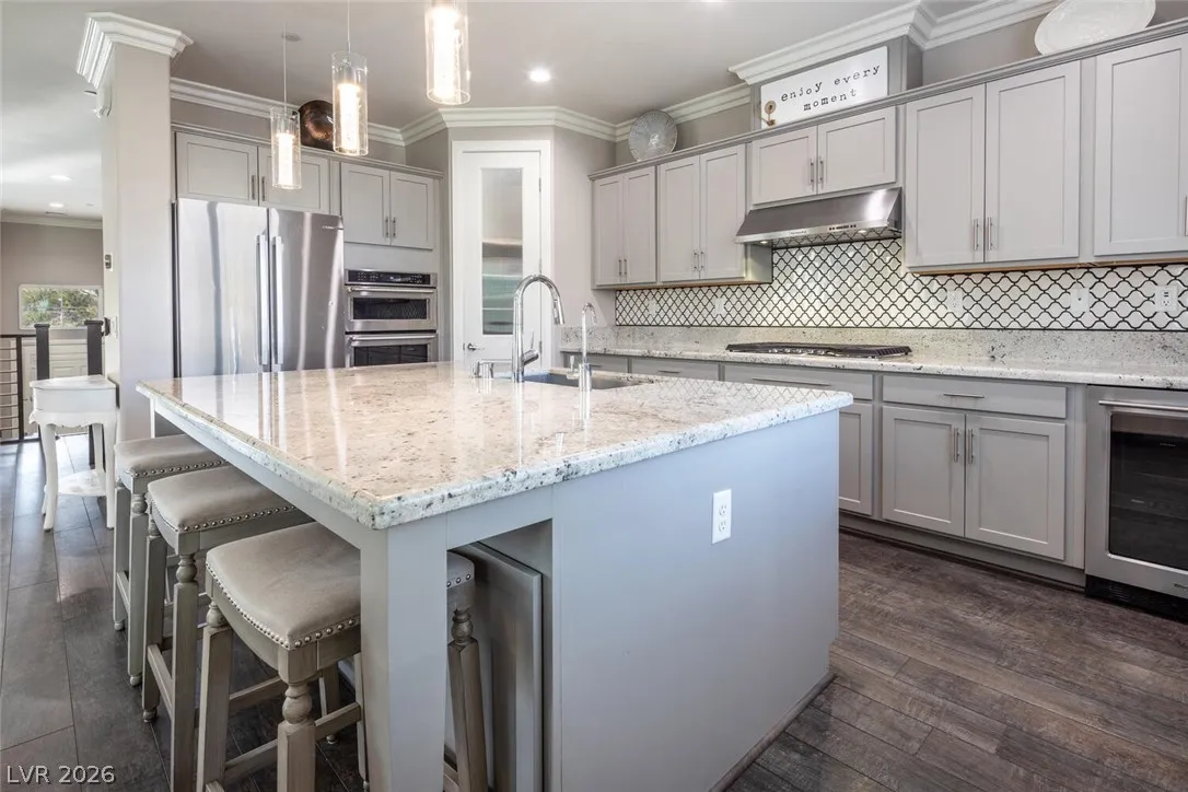 cabinets, a large island, beverage center, pantry, and gourmet stainless steel appliances. Throughout the