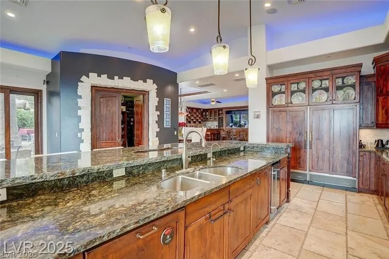 Perched high atop Liege Dr. in the premier MacDonald Highlands community, this custom estate spans 2.1 acres and captures stunning panoramic views of the Las Vegas Strip, city lights, and surrounding mountains. Showcasing striking architecture with natural stone, distressed wood, and grand floor-to-ceiling windows, this home offers multiple levels of outdoor entertaining with a resort-style pool and spa, outdoor kitchen, fire pit, putting green, and expansive terraces. Interior highlights include a gym with steam and sauna, theater, game room, and a two-story owner’s closet. The oversized garage easily accommodates an RV, 6+ vehicles, and a workshop. Nestled behind a second guard gate, this residence combines privacy, sophistication, and unparalleled views — luxury living at its finest.
