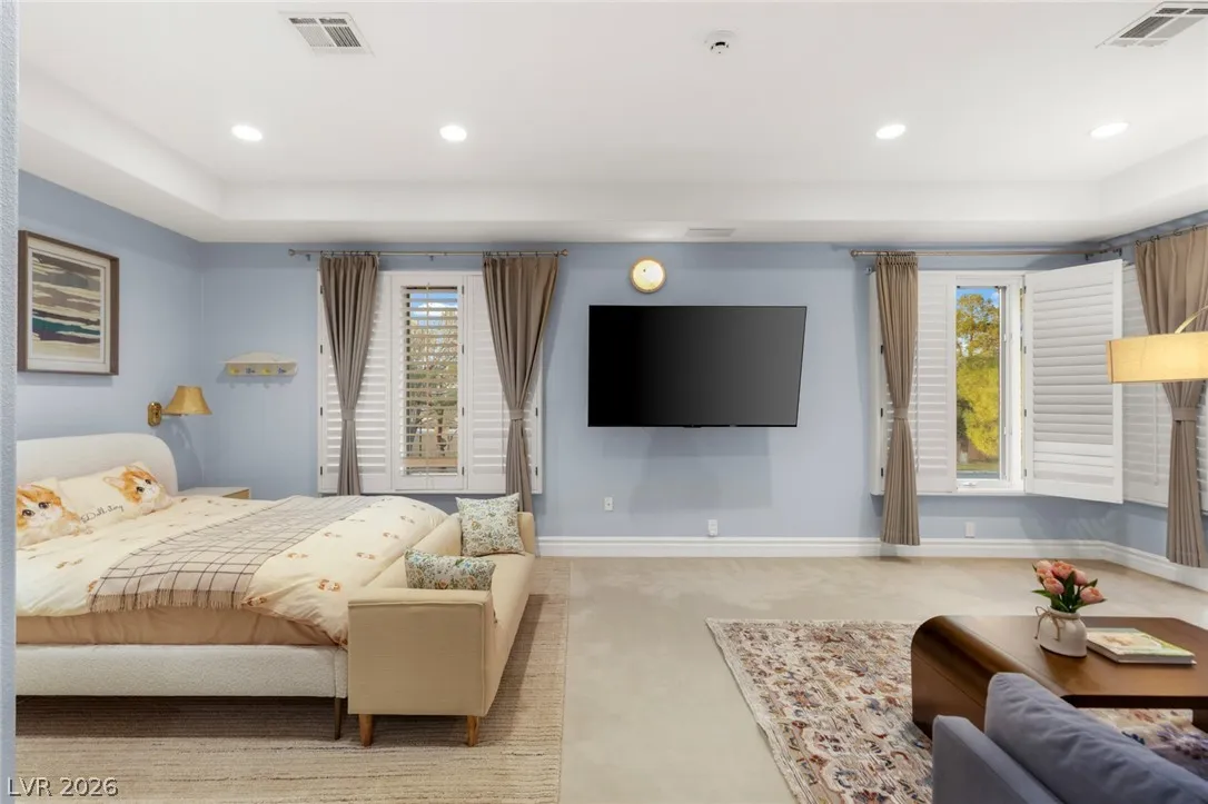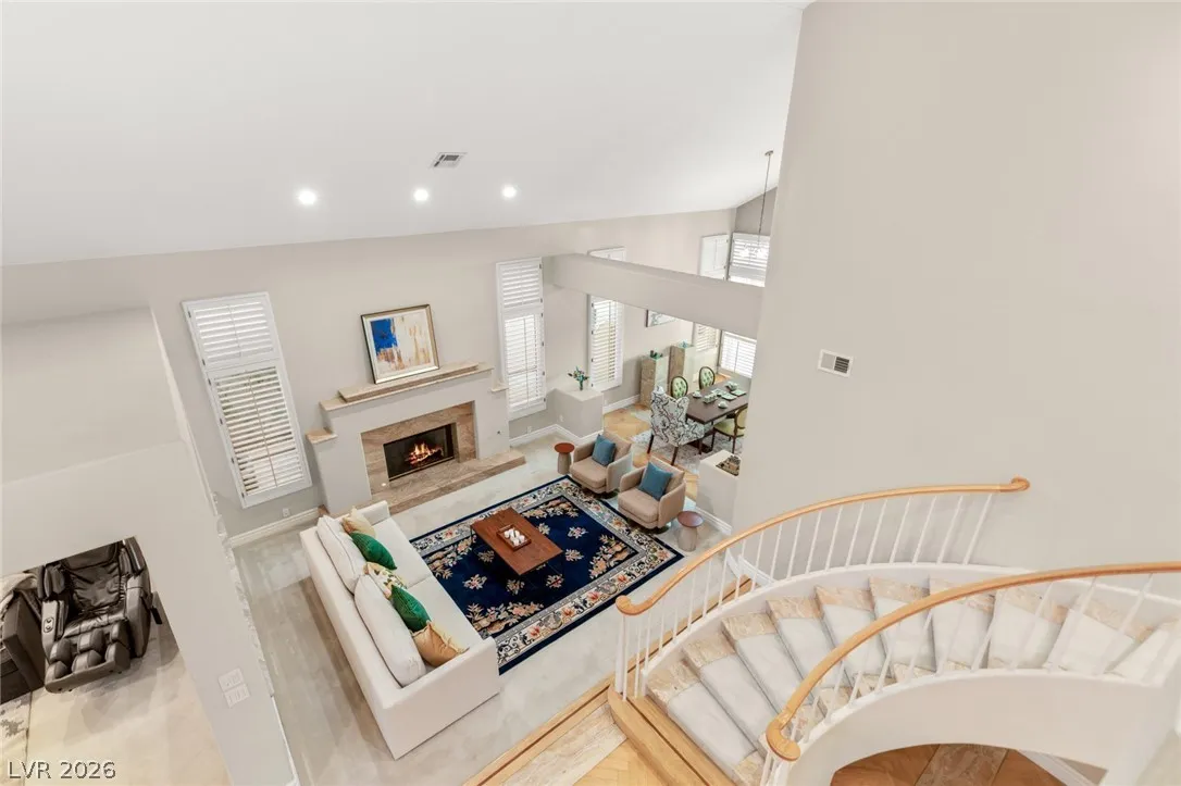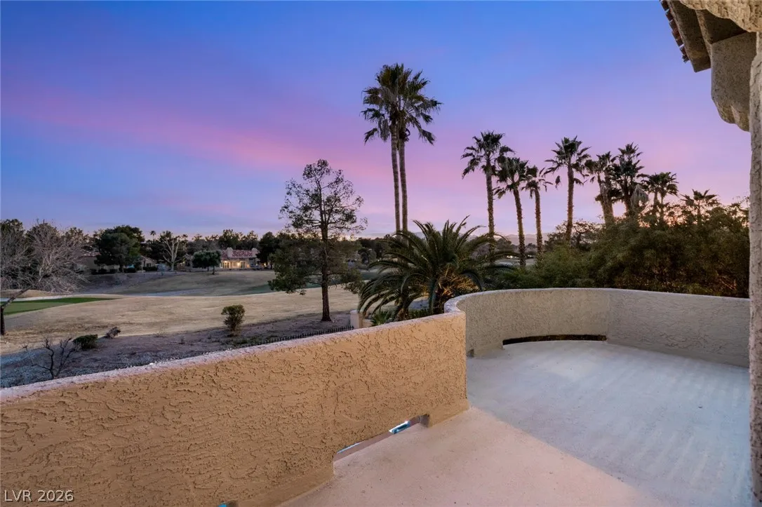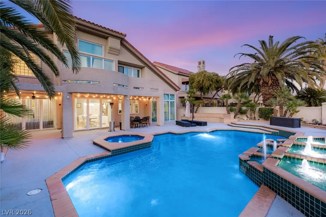Perfectly positioned on the fairway, this elegant estate offers soaring ceilings, a dramatic staircase, and walls of glass framing panoramic golf course views. Natural light fills the open-concept living spaces, designed for refined entertaining and effortless indoor-outdoor living. Upstairs offers a loft, expansive primary suite with vaulted ceilings, fireplace, wraparound balcony, updated spa bath, and multiple cedar-lined closets, plus a junior suite with retreat. This home features formal living with fireplace and dining rooms, and a three-car garage, this home blends luxury with functionality. Step outside to your resort-style pool and spa overlooking lush greens, serene, private, and timeless. Located minutes from Durango Casino & Resort, UnCommons, fine dining, and premier shopping, yet tucked inside one of Las Vegas’ most prestigious golf course communities.