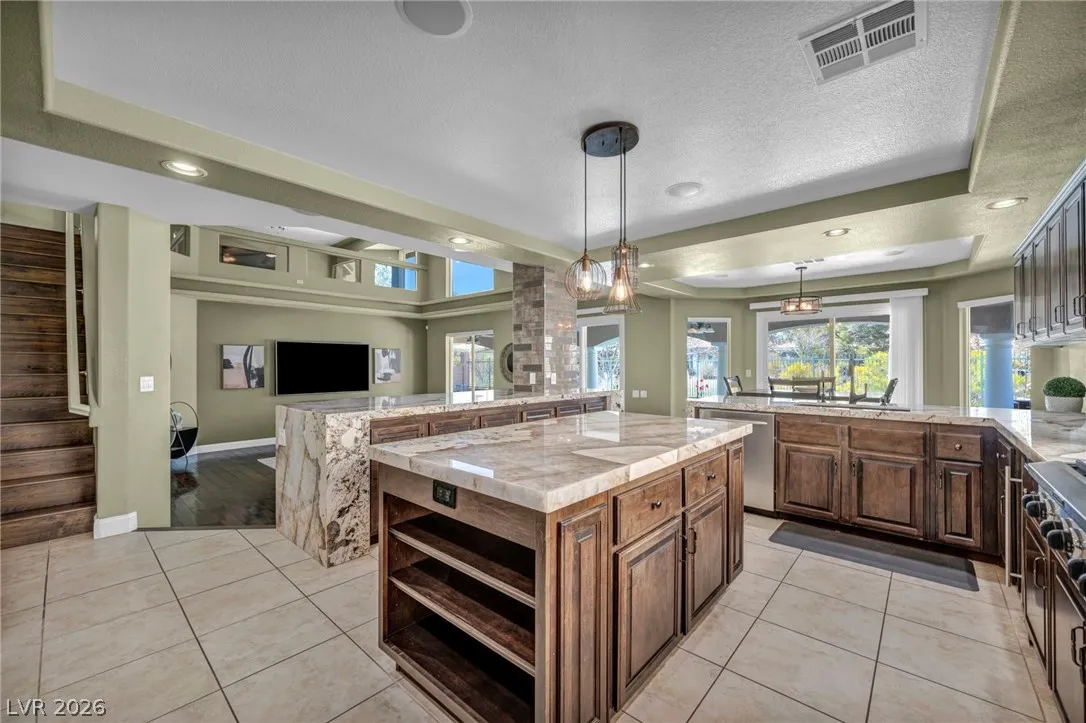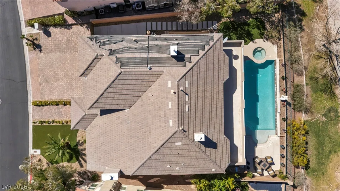 Beautifully remodeled home backs to the Park/Paseo Trail with a second floor balcony and covered patio! Over 5440 sqft with Main Floor Master Suite with Pool/Waterfall/Spa and built in BBQ overlooking the park. Remodeled kitchen with stunning Brazilian Patagonia quartzite waterfall counters and bath with walk in shower and freestanding tub! Lower level features a 4K Dolby Atmos Surround Sound, 130” home theater, and game area. Upstairs features a huge loft that opens up to the balcony overlooking the beautiful park! Large lot has fourth car driveway plus parking pad behind the double gate to the side of the house! Great location with fantastic access to the strip, I-15, restaurants and shopping. Guard gated in prestigious Royal Highlands in the center of Southern Highlands. Most furnishings included!