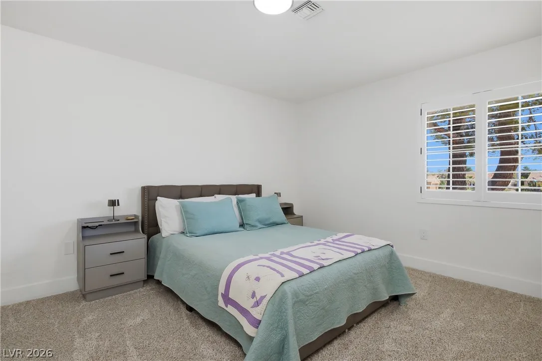 The bright open floor plan is ideal for everyday living and entertaining, highlighted by a large kitchen island and comfortable seating areas. The spacious primary en-suite offers dual vanities and a walk-in closet, while the second and third bedrooms are conveniently located near a full bath. Sun City Summerlin is a premier 55+ community featuring three golf courses, four clubhouses, sports courts, dining, clubs, and activities, all near Downtown Summerlin’s shopping, dining, entertainment, the Triple-A baseball stadium, and the Golden Knights practice arena.