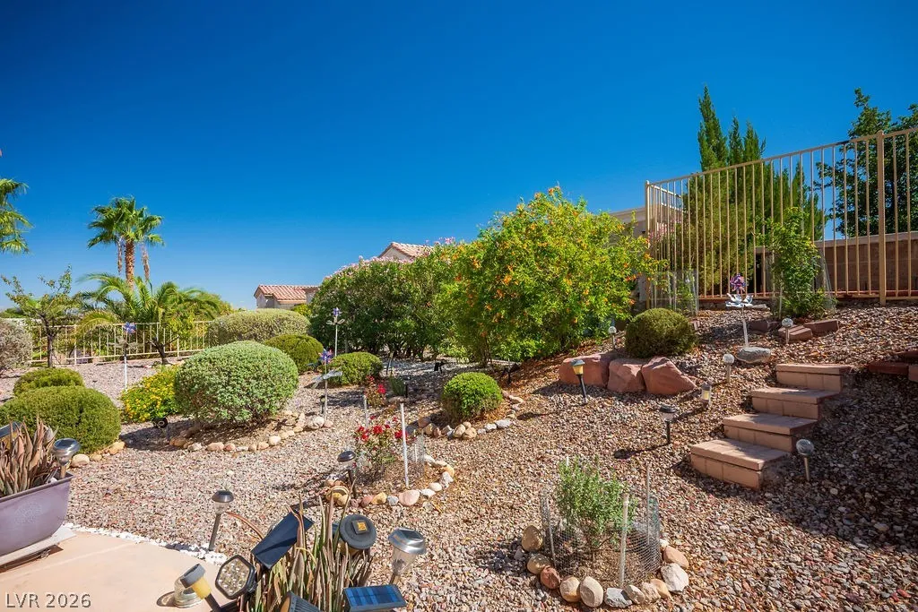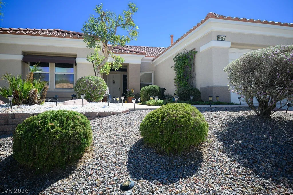 Meticulously maintained 1,520 sq. ft. Royale model featuring 2 bedrooms, 2 baths, and a separate den/office in the newer section of Sun City Summerlin. This desirable floorplan offers an easy-flow layout ideal for both everyday living & gatherings. From the open kitchen with breakfast bar, you’ll enjoy views of the living & dining areas, creating a natural hub for connection. The fully equipped laundry room leads directly to the garage, complete with storage cabinets and newer mechanical systems. Beautifully manicured front landscaping enhances the curb appeal, while the extended covered patio overlooks an easy-care, desert-landscaped backyard with almond and lemon trees—perfect for relaxing or entertaining outdoors. Sun City Summerlin is a premier 55+ active community with 3 golf courses, 4 pools, spas, gyms. Tennis, pickleball & basketball courts available along with a men’s softball league. Nearby Downtown Summerlin with top-tier dining, entertainment, shopping and sports amenities.