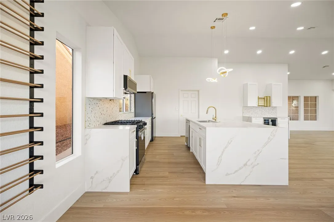 community of Sun City Summerlin has been renovated top to bottom – including brand new cabinets, flooring, baseboards, countertops, tile work, tubs, recessed lighting, fireplace, and fresh paint throughout.