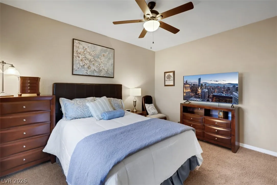 Welcome to 10663 Harvest Green Way, a stunning 3-bedroom, 2.5-bath home in the highly desirable Amado neighborhood of The Mesa Village in Summerlin South. Built in 2013, this 2,450 sq ft residence features an open-concept layout with high ceilings, abundant natural light, and a spacious great room that flows into a modern kitchen with granite countertops, stainless steel appliances, and a large island ideal for entertaining. Upstairs, the primary suite offers a relaxing retreat with dual vanities, a soaking tub, and a walk-in closet. Additional bedrooms provide flexible space for family, guests, or a home office. The private backyard features pavers, synthetic grass, and mature landscaping, creating a great setting for outdoor living and privacy. Residents enjoy access to a resort-style pool, parks, and scenic walking and biking trails. Ideally located minutes from Downtown Summerlin, Mesa Park, and Red Rock Canyon, this home offers convenience, and the best of the Summerlin lifestyle!