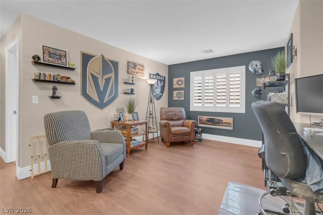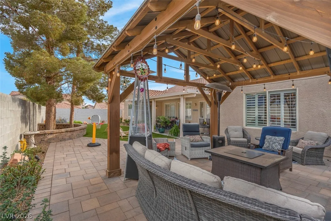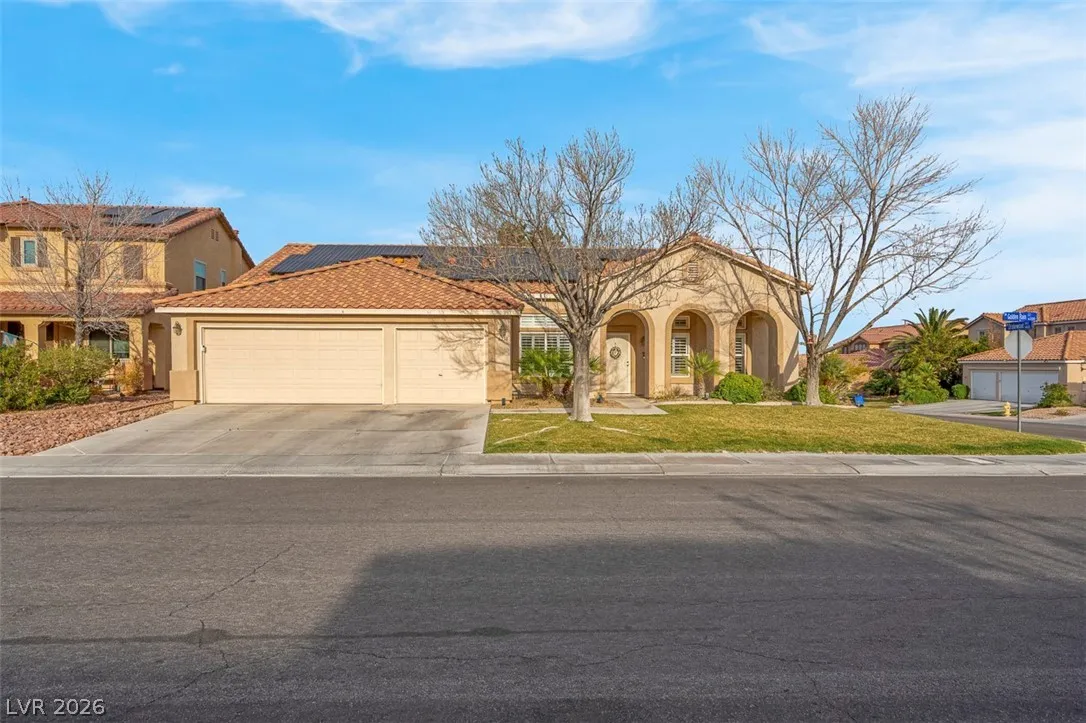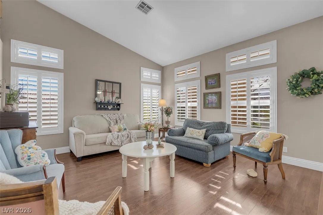 Beautifully remodeled and filled with upgrades, this stunning XL corner-lot home truly reflects pride of ownership. Vaulted ceilings and abundant natural light create an open, airy feel, while custom shutters and new flooring throughout the main living areas add style and comfort. The kitchen features newer appliances (1–2 yrs old) extended counterspace, outlets above cabinets for addt’l lighting and opens to a welcoming family room with built-in storage with a wine rack—perfect for entertaining. The spacious primary suite includes a walk-in closet with custom built-ins, and the bathrooms have been tastefully remodeled. Step outside to a gorgeous, fully redesigned backyard oasis complete with a pergola and covered patio—ideal for relaxing or hosting gatherings. Conveniently located near beautiful parks within walking distance and just minutes from shopping, the 215 freeway, and Nellis AFB. A truly loved and meticulously cared-for home that shows at every turn-making it a must-see!