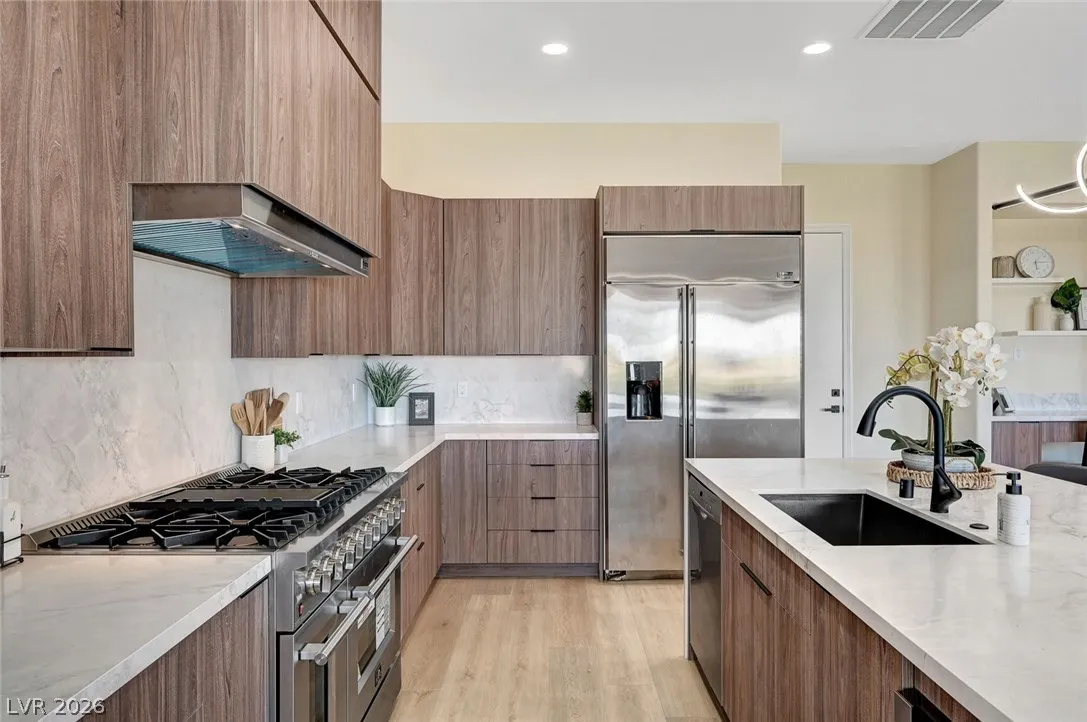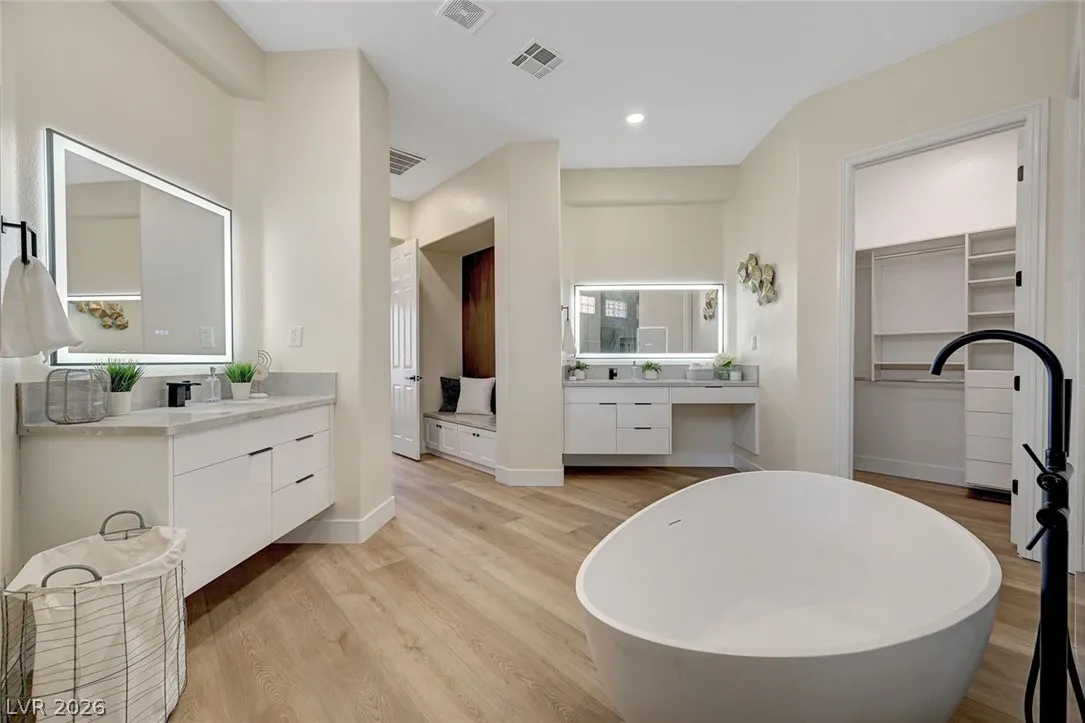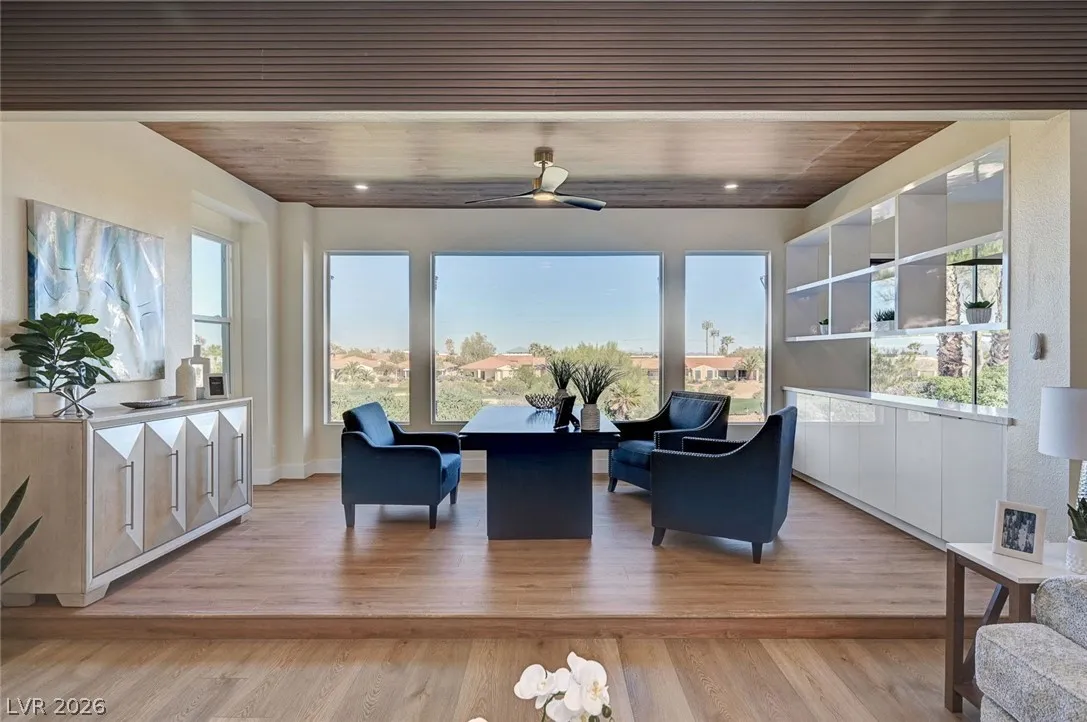 Discover this exquisite 1-story residence in Siena, a prestigious guard-gated 55+ golf community. Perfectly positioned to capture panoramic views of the Las Vegas Strip and lush fairways. Spanning 3,208 sq ft, the home is facing east—filling the space with natural light. The home welcomes you with a modern-style frontyard designed for curb appeal and easy maintenance. The backyard opens directly to the golf course, offering breathtaking unobstructed views of the fairways and Las Vegas Strip. An artificial glass golf way adds a unique feature for golf lovers. Recently remodeled, the home boasts fresh interior paint and luxury vinyl flooring throughout. An elevated sunroom can be used as a den, or additional sitting area. Primary suite provides a retreat, featuring a spacious primary bathroom and large wardrobes. 2 additional bedrooms share a Jack-and-Jill bathroom with enlarged walk-in showers. A dedicated back-office area at the end of the hallway adds flexibility for work or hobbies.