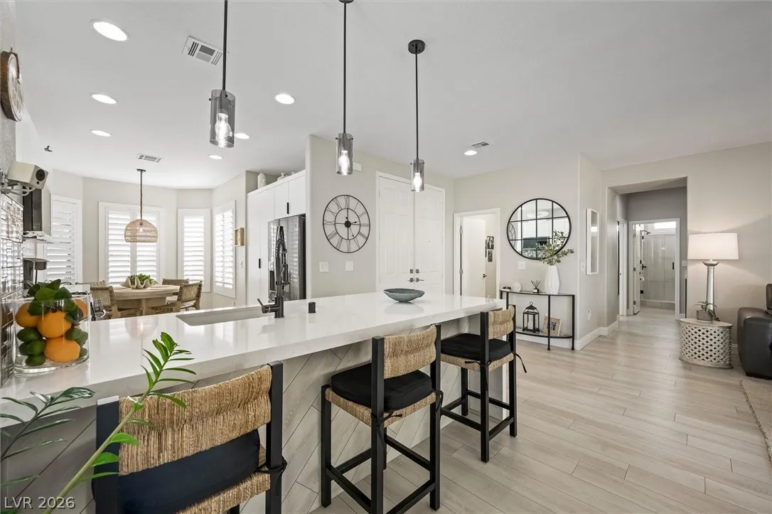 Beautifully updated single-story home in the highly desirable age-restricted community of Siena in Summerlin. This rare find offers an open floor plan filled with natural light and a perfect blend of comfort, style, and modern upgrades. The home has been thoughtfully renovated with custom cabinetry, luxury vinyl plank flooring, updated baseboards, modern lighting, ceiling fans, quartz countertops, brushed-nickel hardware, shutters, glass-and-aluminum shower enclosures, fresh paint, updated plumbing, and a new water heater.