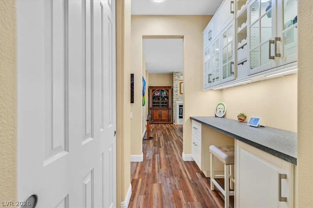 Impeccably maintained, Single Story 4 Bedroom home in the vibrant community of Anthem Highlands. Tall 9ft ceilings, Exquisite Hardwood floors & neutral paint set the tone for a warm, fresh, & inviting feel. Timeless Stacked Stone fireplace in Great Room seamlessly connecting the Kitchen & Dining Area. Kitchen boasts Granite Counters, Island with storage and seating plus tile backsplash & spacious pantry. Dining area has bay window with tranquil views of picturesque park-like backyard with Black Mountain in the foreground. Primary Bedroom is separate from others with convenient slider to Backyard/Patio. Large Primary Bath with 2 separate Vanities, separate Tub & Shower & Walk-In Closet. 3 additional bedrooms with flex space to use as bedrooms, den or office. Ceiling Fans & Blinds throughout. Don’t miss this MOVE-IN ready home ideally situated next to Sloan Canyon, Anthem Highlands offers residents unparalleled access to hiking trails, natural beauty GREAT schools & convenient shopping.