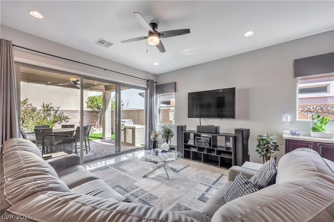 Built in 2020, this stunning single story home is located in a gated community! PAID off SOLAR! Like new 3 bedrooms 1936sq. ft ~ Luxury upgrades, sleek modern design~Step in to 18ft ceiling at foyer~ Open concept design offers seamless views of the Courtyard, the Great room, the Kitchen and the Patio~10ft ceilings and ceiling fans throughout~Airy and sizable Great Room leading to the covered Patio~Generously sized Primary bedroom with en-suite luxurious Primary bathroom~Enjoy outdoor living as you walk through a three paneled sliding glass door with retractable screen where backyard offers an above ground spa, artificial turf and low maintenance landscaping~Both a latticed covered Courtyard with fireplace and a covered Patio with a built in barbecue~Convenient access to the 215 freeway, shopping and dining areas. This one is a Buyer’s dream!