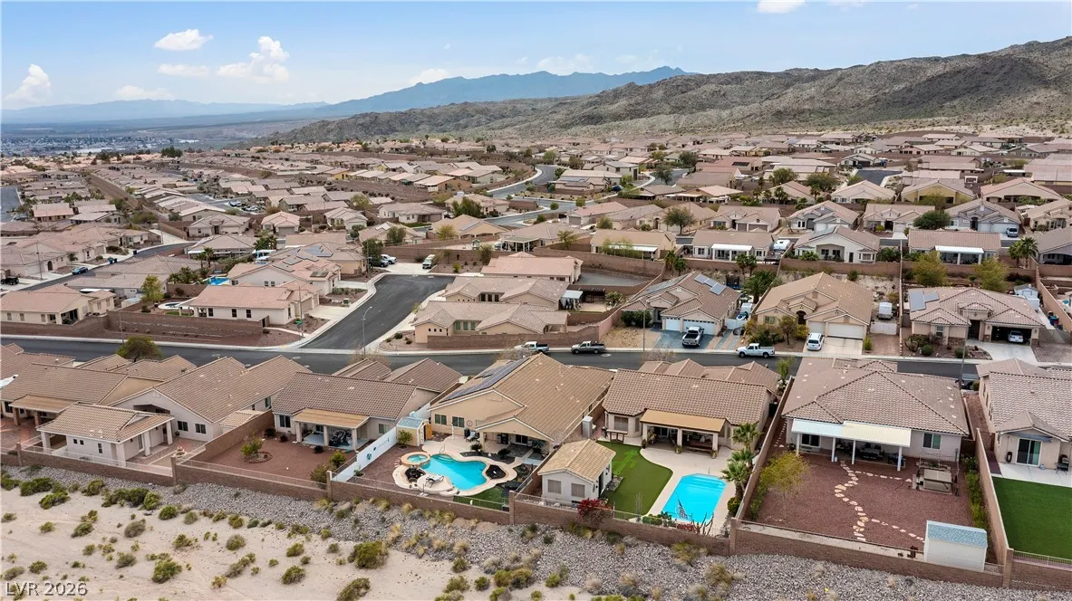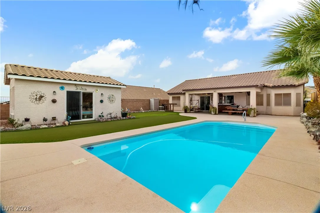BACKYARD OASIS WITH A POOL AND PRIVATE DETACHED CASITA GUEST SUITE! Welcome to 2516 Morrow Ridge Place, a beautifully designed 4 bedroom, 2 bath home offering 1,964 sq ft of open living space plus a 280 sq ft CASITA, giving a grand total of 2244 sq ft. Laughlin’s most desirable community. BILBRAY RANCH The backyard is built for entertaining with a covered patio, sparkling pool, lush low maintenance synthetic lawn, and added privacy with no rear neighbors. Inside you will find a spacious living area that flows into a well appointed kitchen with breakfast bar, pantry, casual dining area, and a separate formal dining room. The primary suite showcases a vaulted ceiling and a full ensuite bath with dual sinks, walk in shower, standalone tub, and generous walk in closet. A 3 car garage offers ample space for vehicles, river gear, and all your desert toys. Minutes from the Colorado River, casinos, shopping, and dining. Live where others vacation and enjoy Nevada’s NO STATE INCOME TAX today!