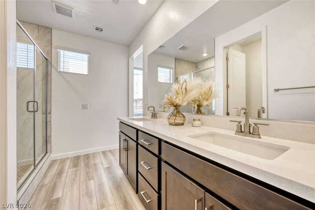 Elevated finishes include touch-less kitchen faucet, comfort height toilets, 8’ interior doors, designer tile shower surrounds, finished garage, 220V EV charging, and insulation between floors. Perfectly positioned along tree-lined trails in beautiful Kestrel Commons Village, moments from the 215—this home defines modern luxury living in Summerlin.