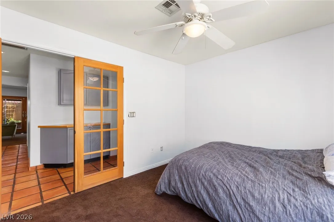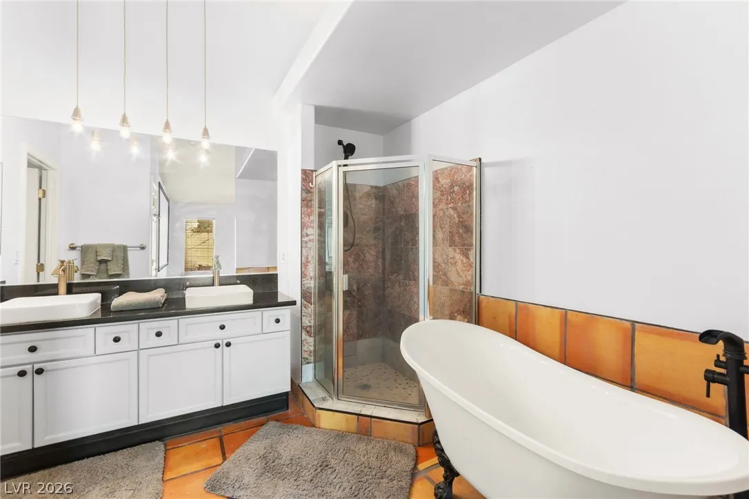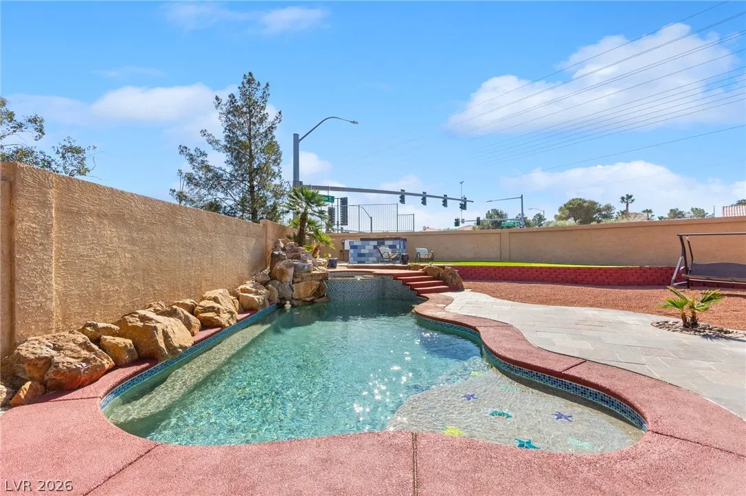 Beautiful single-story home on an oversized corner lot with a 3-car garage, RV gate, pool, and spa. Amazing curb appeal with a large driveway, mature trees, lush landscaping, and an inviting slate-tile courtyard entry. Inside features an open living and dining area with vaulted ceilings, gas fireplace with TV wall, dual ceiling fans, and French doors leading to the covered patio. The spacious chef’s kitchen offers an island, abundant cabinets and counter space, walk-in pantry, double ovens, additional oven with gas cooktop, built-in microwave, wet bar, and recessed lighting. Guest bedrooms feature ceiling fans and natural light, while the guest bath includes quartz counters and a vessel sink. The oversized primary suite includes a den/theater space, built-in desk nook, French doors to the backyard, and a spa-style bath with freestanding tub, walk-in shower, dual vessel sinks, and large walk-in closet. Backyard features slate patio, PebbleTec pool/spa, stucco walls, and RV parking slab.