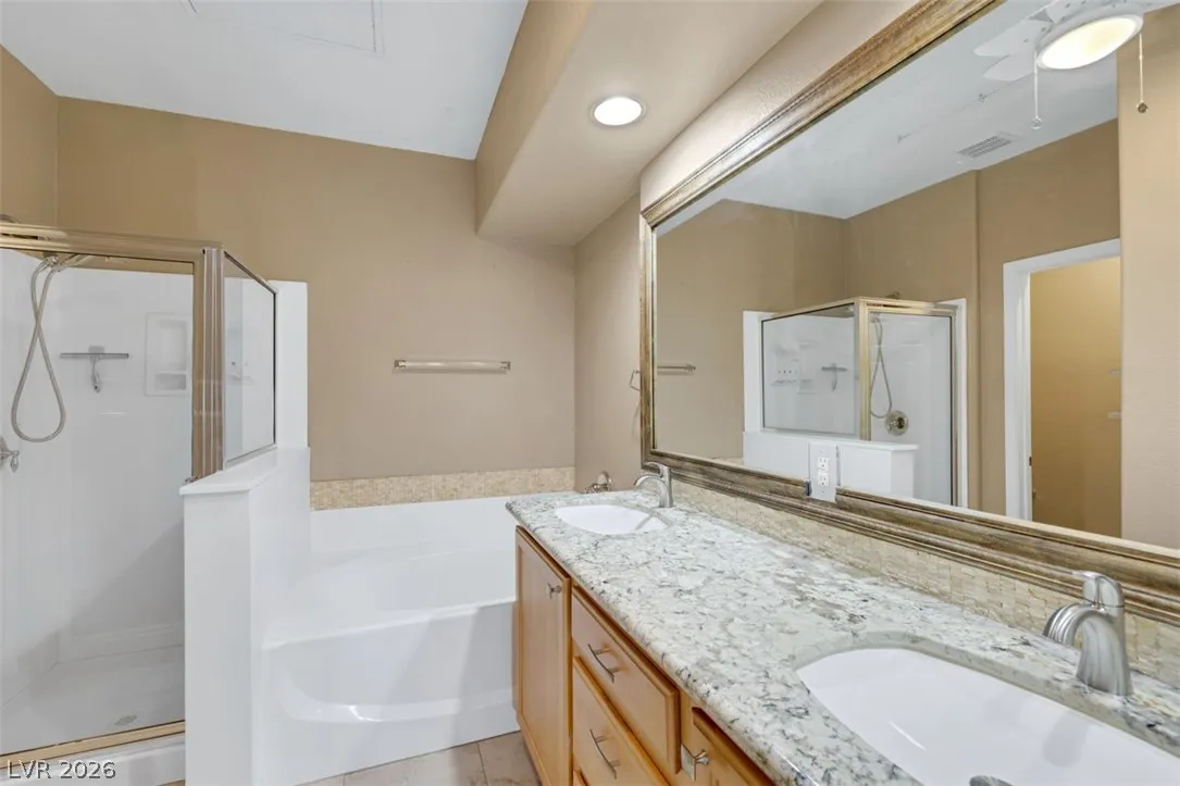 This house is gorgeous! Newer window throughout with lots of natural light, french door slider with a balcony that offers a view of the strip and pool. High ceilings, upgraded granite counters, two balconies, and a downstairs room. All this plus a two car garage a park like community grounds.