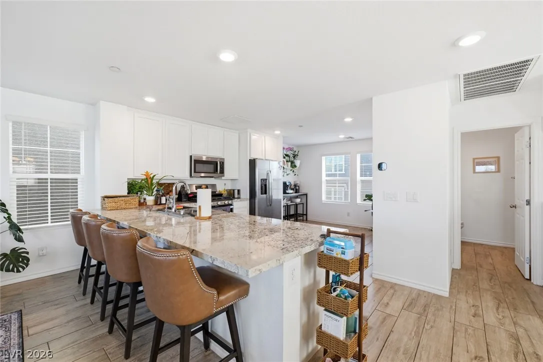 The spacious primary suite provides ample room for larger furnishings and a fitness area. The third-floor living room offers generous space for entertaining and flows seamlessly into a bright, open kitchen with stainless steel appliances, abundant counter space, pantry, and adjacent dining area.